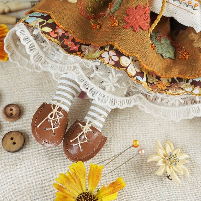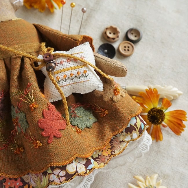 Cumin's dress is a hand applique and embroidered fine cotton, recycled from my daughter's summer trousers. It is teamed with a tiny piece of Liberty fabric both with the applique leaves and with the underskirt. I am trying to use tiny pieces of fabric in a creative way, repurposing rather that throwing away. She was a joy to make and I love the autumn look xx