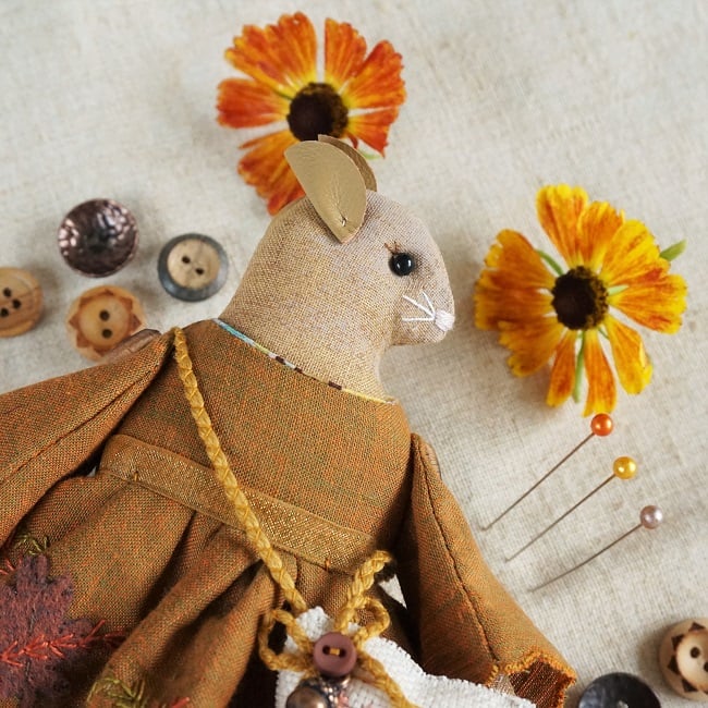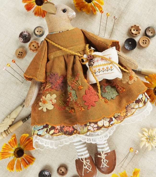 This is Cumin, a tiny brown mouse. She is a hand embroidered mouse with little leather ears and tail. She is dressed in a an applique and embroidered dress with an autumn feel She has coordinating underskirts and cotton lace bloomers. Her dress is finished with organza ribbon, tiny buttons and little leather shoes.