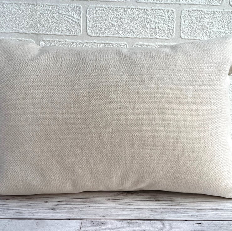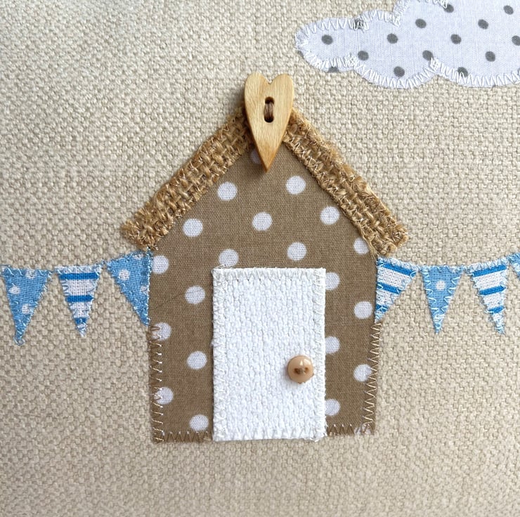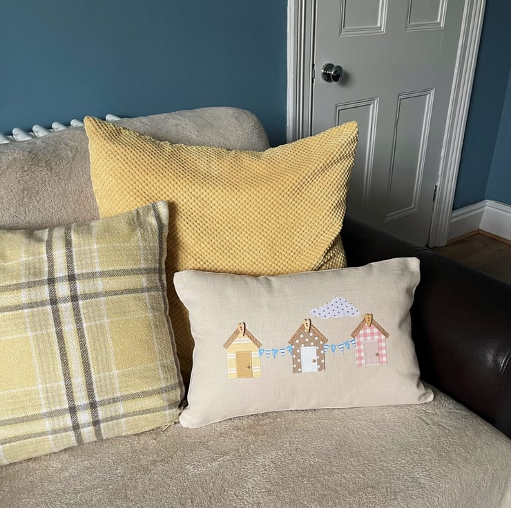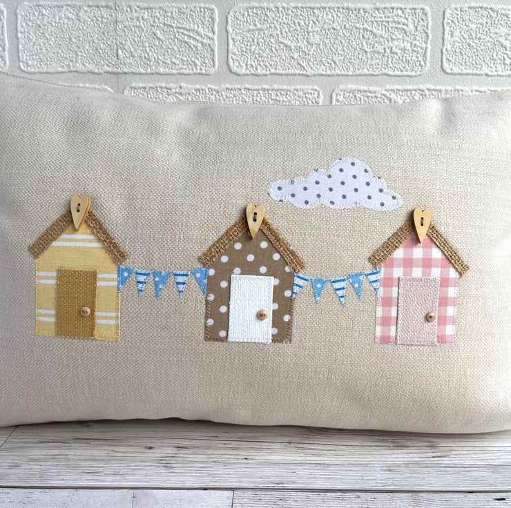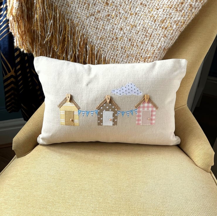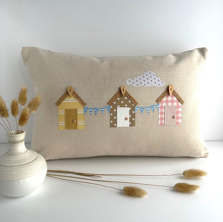 Beach huts cushion with bunting. This rectangular cushion is made from warm cream fabric with an appliqué scene featuring three beach huts, bunting and a cloud. The huts are made from pastel fabrics, one in pale yellow with white stripes, one in beige with white polka dots, and one in pale pink and white gingham. The huts each have a hessian roof with a natural wood long heart shaped button at the apex. The doors are plain and match the hut colours, and I've added a tiny beige button door handle to each one. Between the huts are strings of blue bunting with white stripes and polka dots. The scene is completed with a fair-weather cloud in white with grey polka dots. The cover has a concealed zip along the bottom and comes with a polyester hollow fibre cushion pad which conforms to safety regulations.