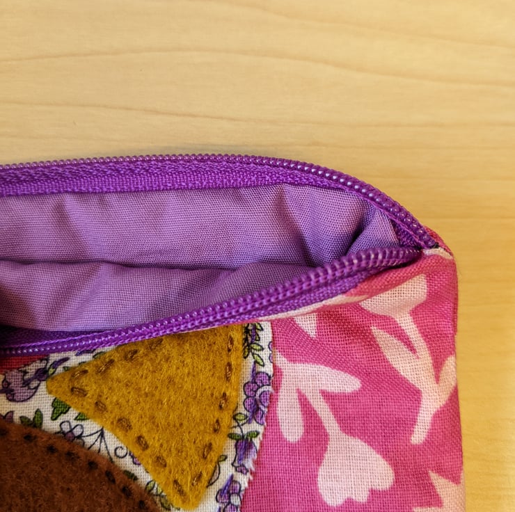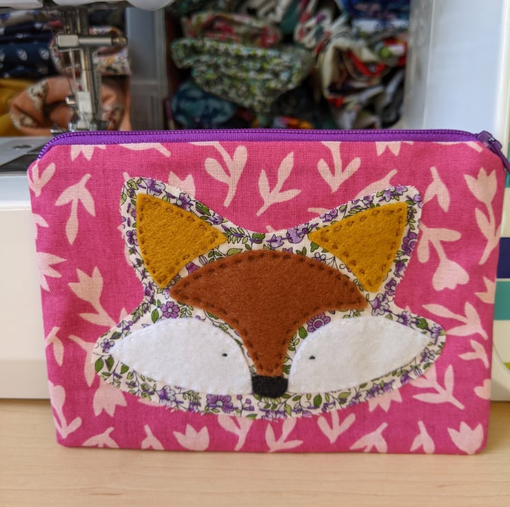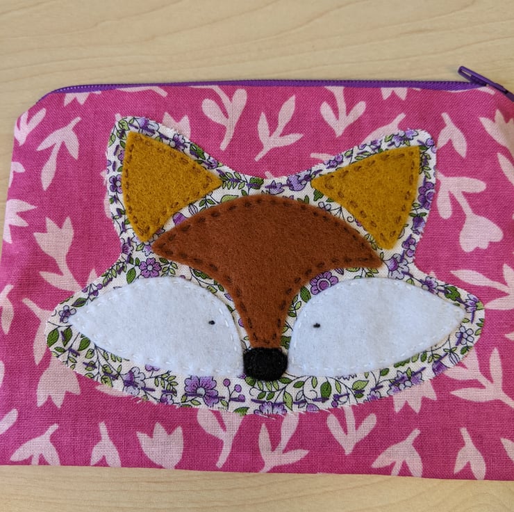 Lined, handmade and hand-appliquéd fox coin purse with purple zip and light purple lining. The main fabric is a pink 100% cotton with light pink flower silhouettes.