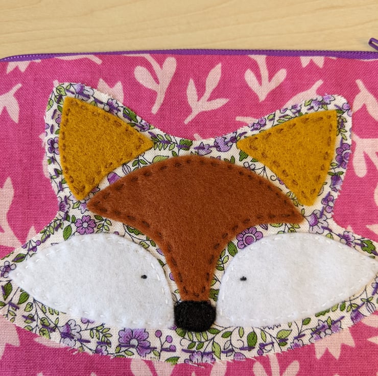 The appliqué fox is backed with a white cotton with purple and green flowers. Brown, white and black felt overlays are hand stitched in place to form the fox.