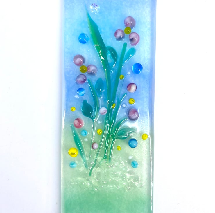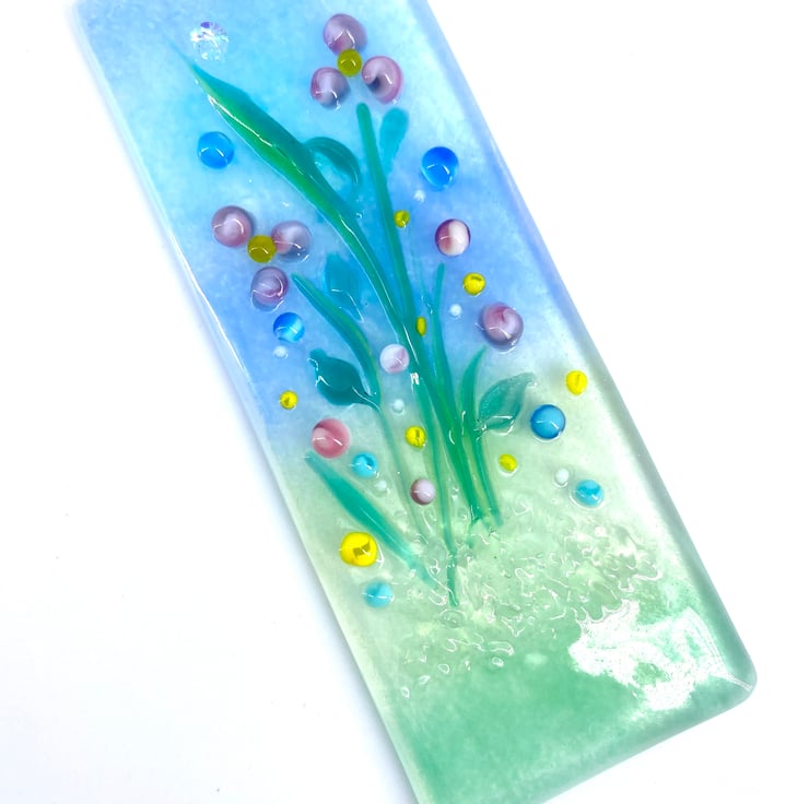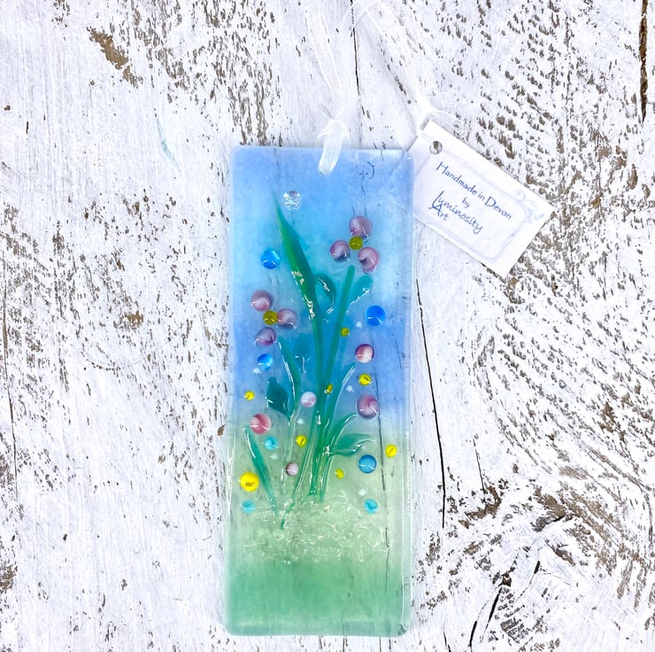 A lovely fused glass light catcher with a mix of pastel flowers. Hung on a piece of organza ribbon it allows the light to travel through - this gives the piece depth and shows off the full beauty of the glass.