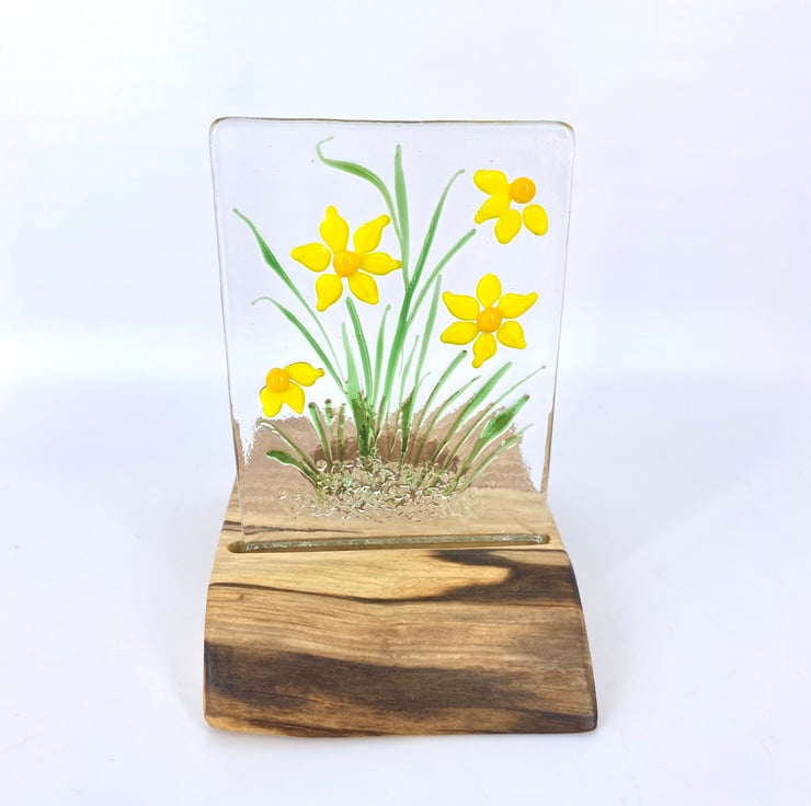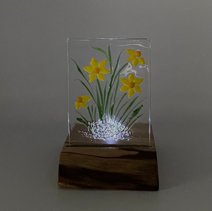 A spray of daffodils sat in a beautiful handcrafted spalted wood, base that houses a tea light.