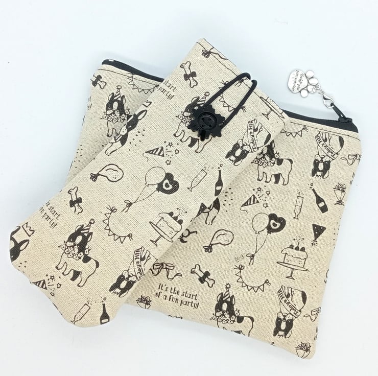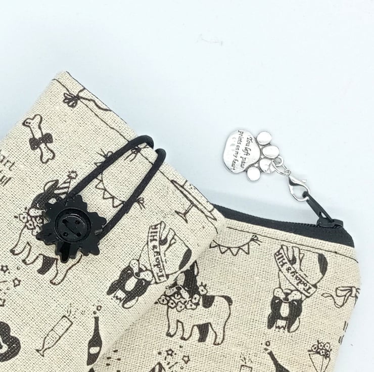 The Make up bag measuring 18 X 15 cm is wadded and lined in black cotton with a cute paw print zip pull that can be attached to anything.