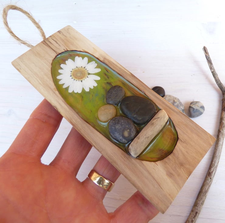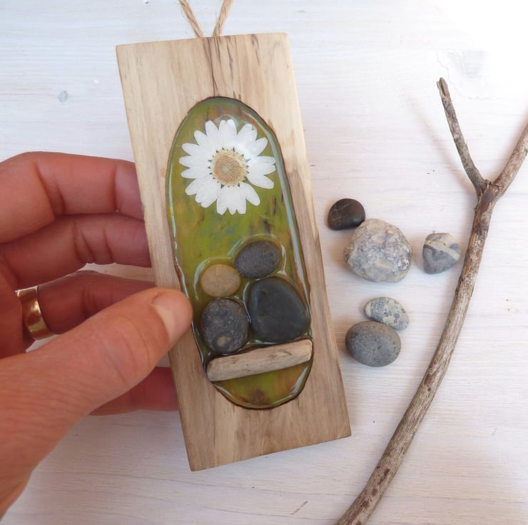 This is one of my unique creations of combining wood, pebble art and resin! Handcrafted from natural wood that has been cut and sanded by hand leaving some of the bark exposed. I have used real pressed flowers and pebbles, all firmly set together in resin. No two are the same.
