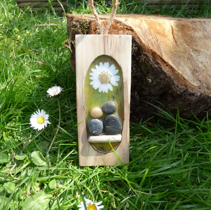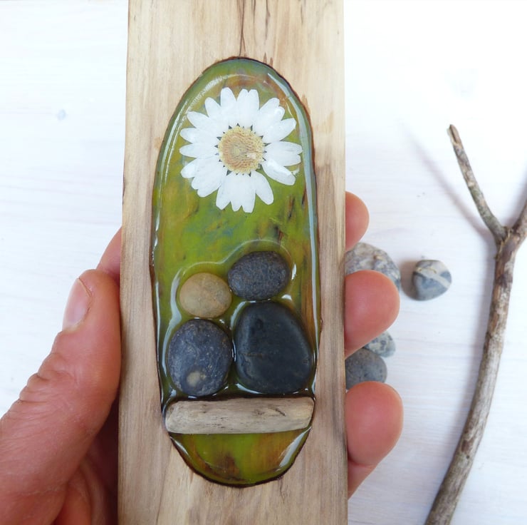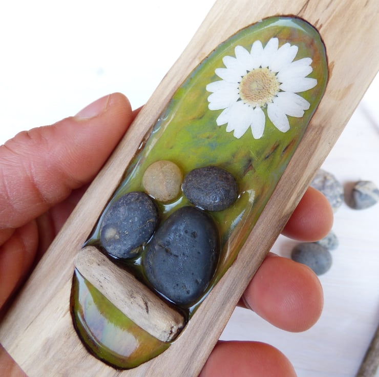 This is one of my unique creations of combining wood, pebble art and resin! Handcrafted from natural wood that has been cut and sanded by hand leaving some of the bark exposed. I have used real pressed flowers and pebbles, all firmly set together in resin. No two are the same.