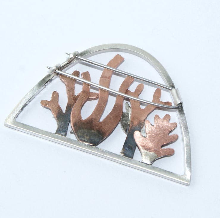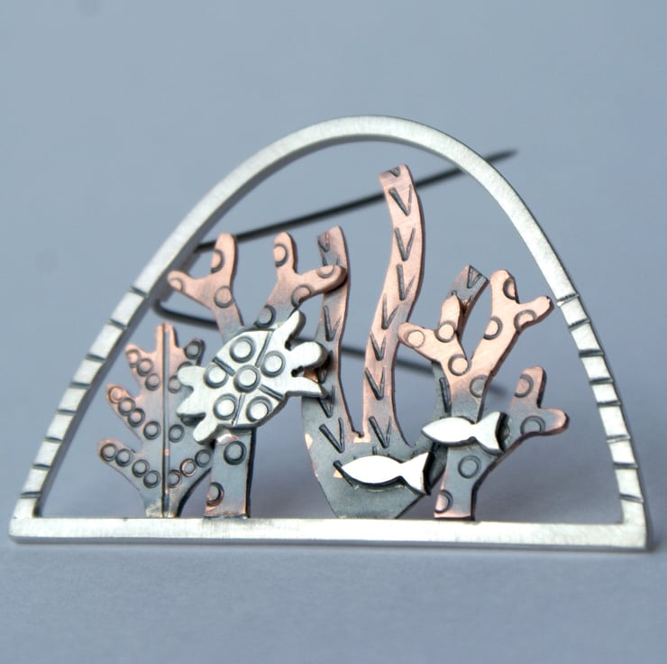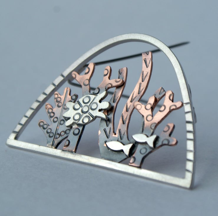 SALE - A lovely silver and copper brooch featuring hand cut copper seaweed with a little silver turtle and some fish set within a sterling silver arch. The metal has been textured, oxidised and rubbed back for depth. The brooch pin is hand made from stainless steel for extra strength.