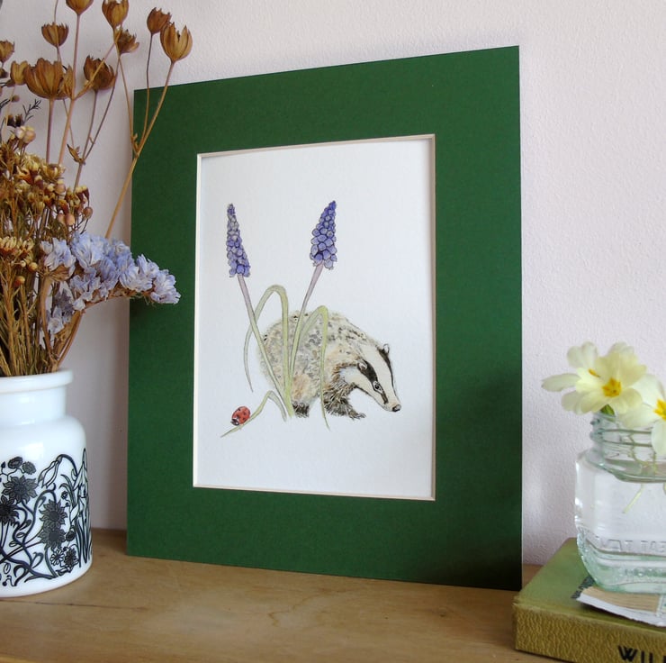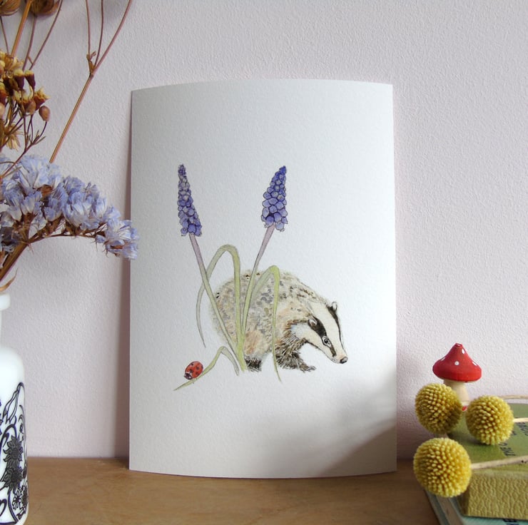 My watercolour painting of a badger and grape hyacinth inspired by spring walks in the woods printed using the giclée method onto archival paper. A charming print for wildlife lovers.