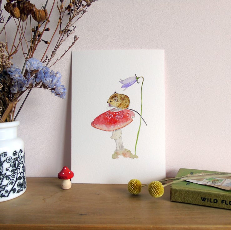 My watercolour painting of a tiny field mouse nibbling on a fly agaric toadstool inspired by walks in the Northumbrian woods printed using the giclée method onto archival paper. A charming print for wildlife lovers.