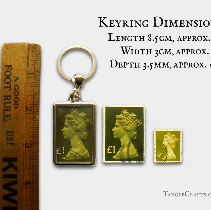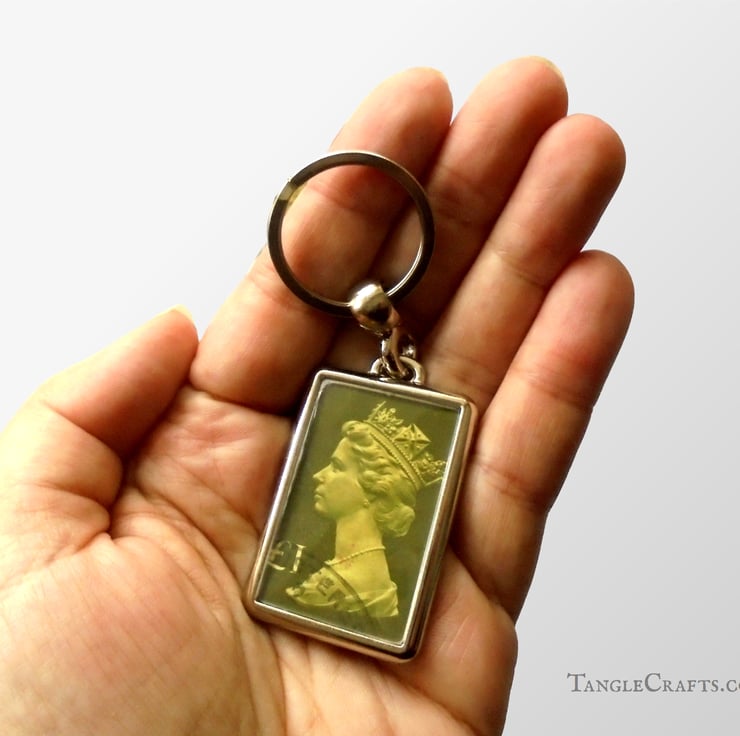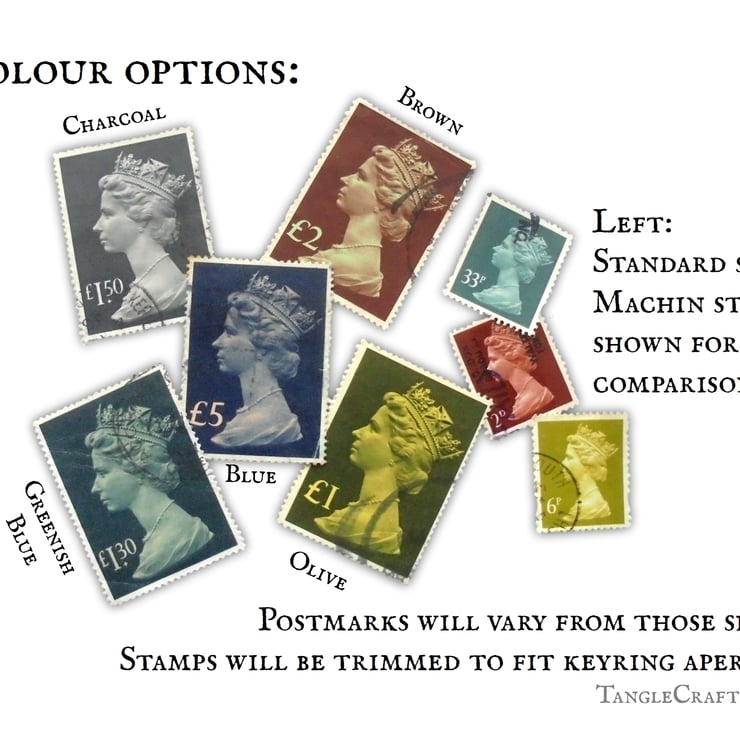 Carry an icon of British postal history wherever you go, with this upcycled keyring framing a real vintage stamp, in your choice of colour. The classic Machin definitive featuring an iconic profile portrait of Queen Elizabeth II has been issued in a rainbow of colours since the 1960s - these oversized issues from the 1970s-1980s are less common but carry the same iconic image. A wonderful souvenir of what is now a bygone era!
