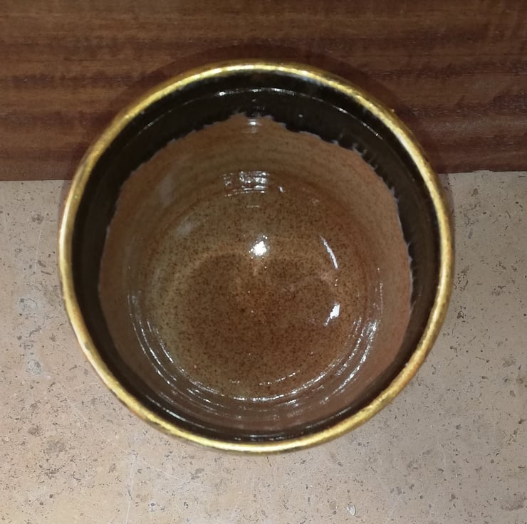 BG4 Glossy mottled deep blue glaze outside old gold rim. Darker orangey speckled beige inside.