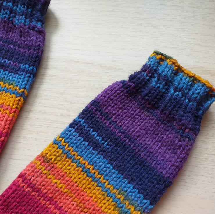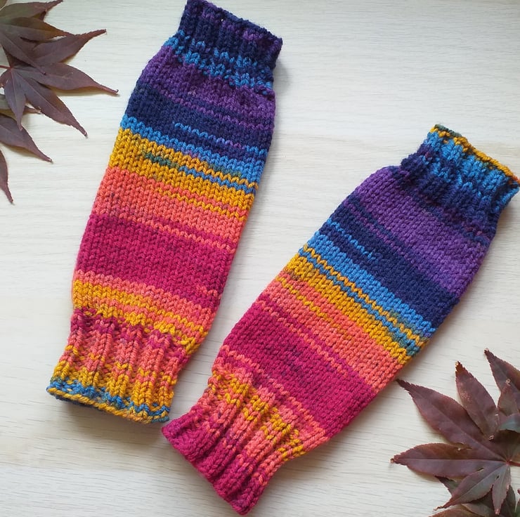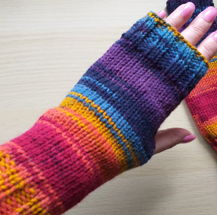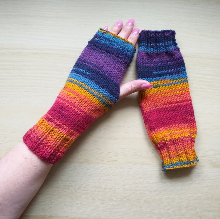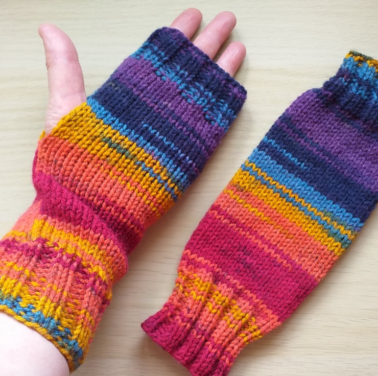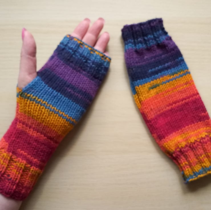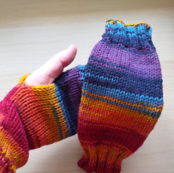 Knitted with a variegated yarn means no two gloves are the same. I will send a photo of your gloves to make sure you are happy with them before I dispatch.