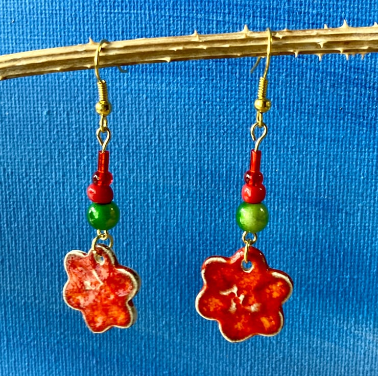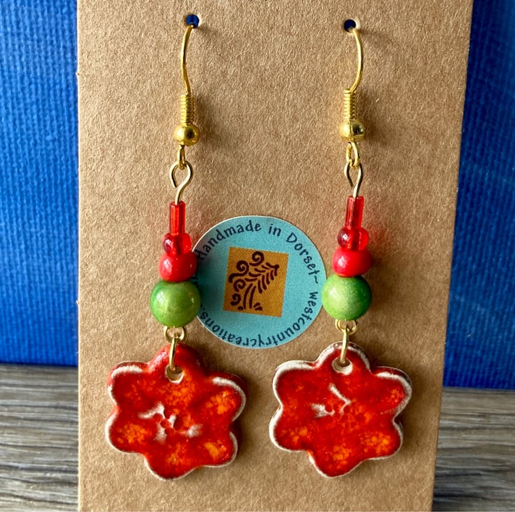 Incredibly lightweight, handmade ceramic flower shaped earrings. Glazed in a flame red earthenware with bright green miracle beads and glass bead detail. Gold plated fishooks complete them.