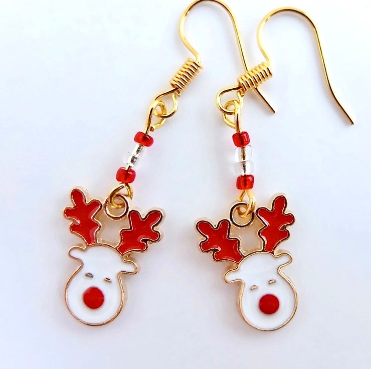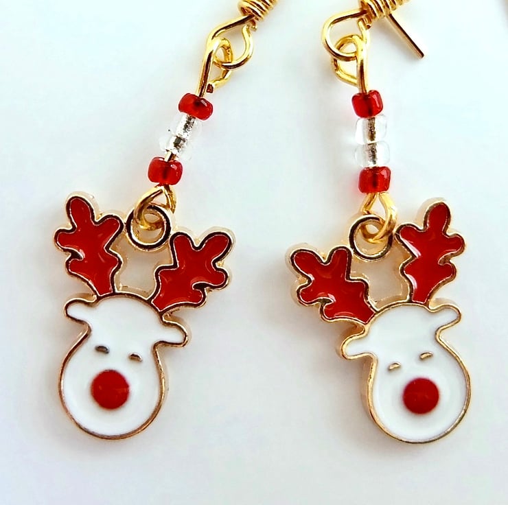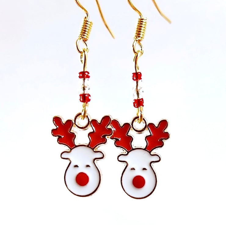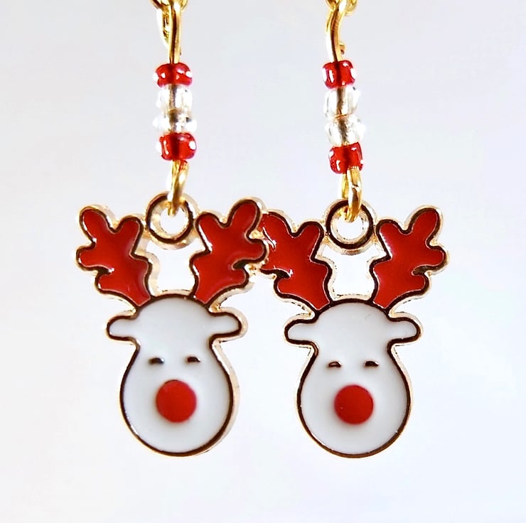 Sweet little reindeer charm earrings enhanced with red and clear glass seed beads.