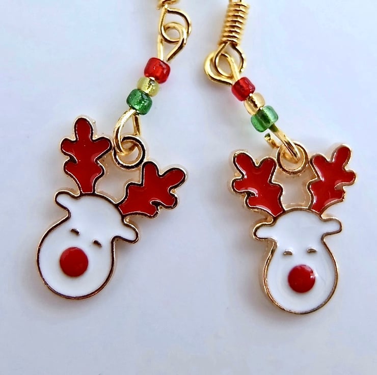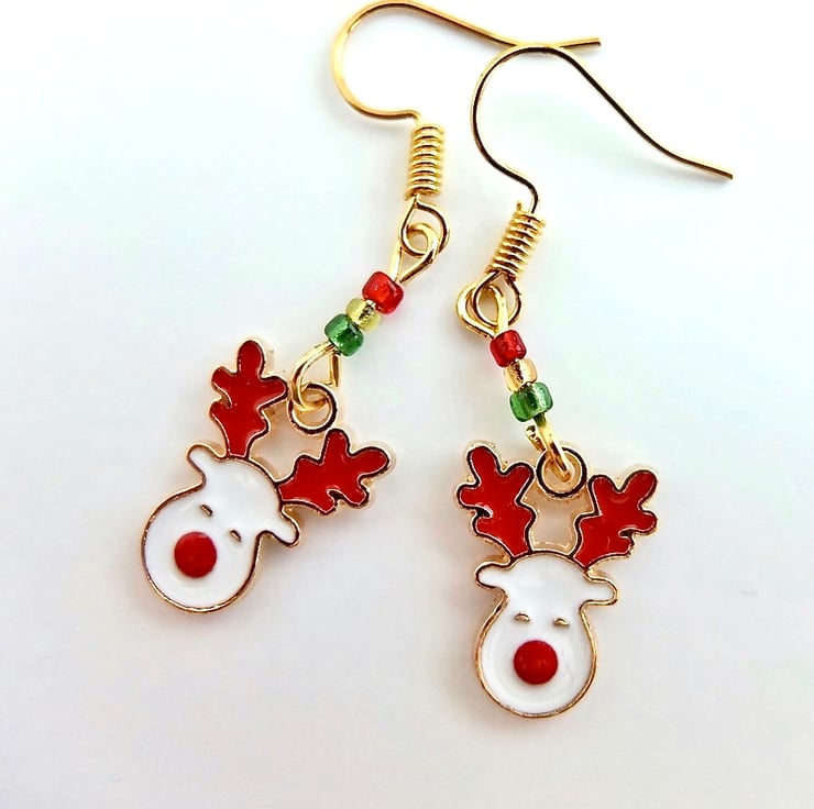 Sweet little reindeer charm earrings enhanced with festive coloured red, gold and green glass seed beads.