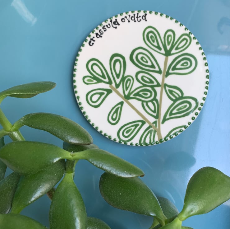Individually hand painted in a geometric design, each coaster represents a well loved house plant. A row of 3D coloured dots around the rim adds the final flourish. The botanical Latin plant name is handwritten around the edge as a nod to Darwin’s style of recording plants.