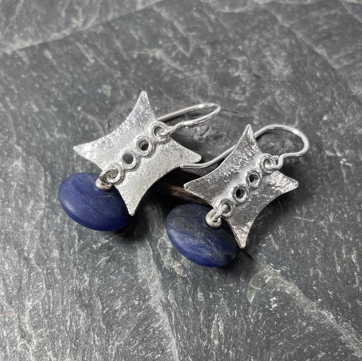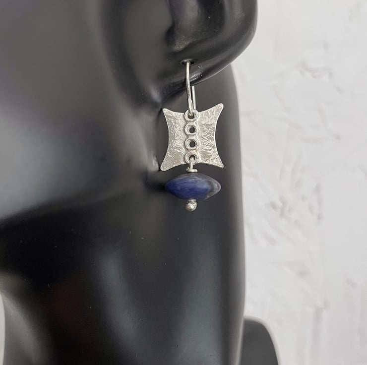 Fused silver earrings with matte navy blue sodalite rondell beads.