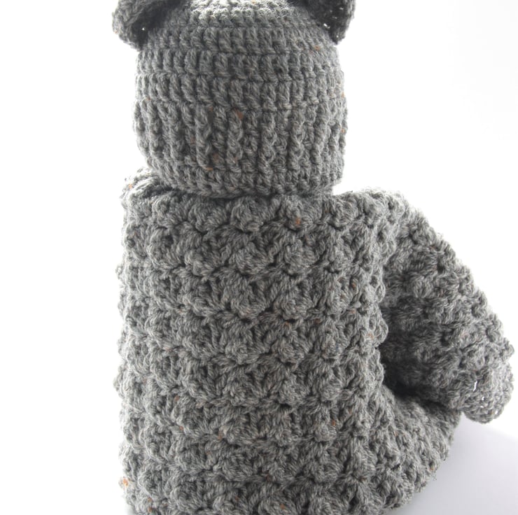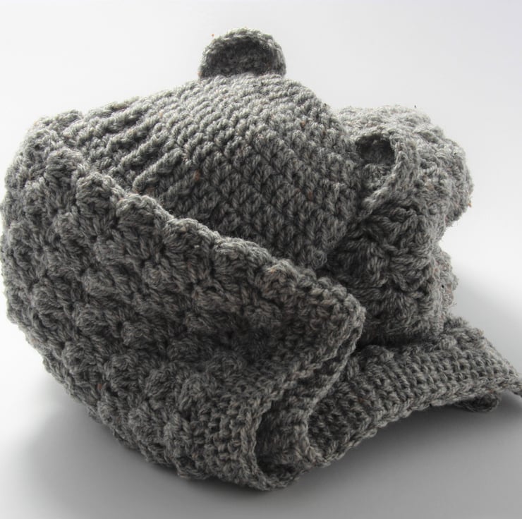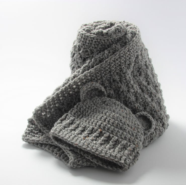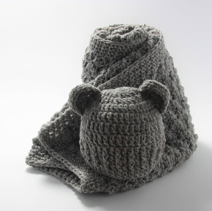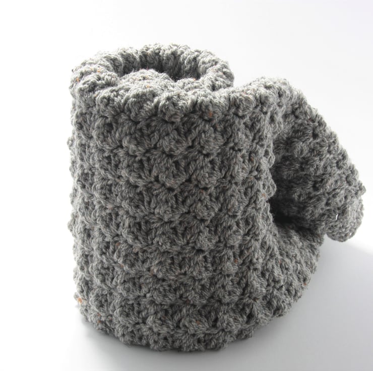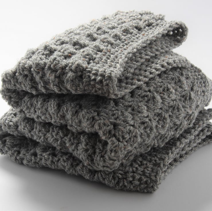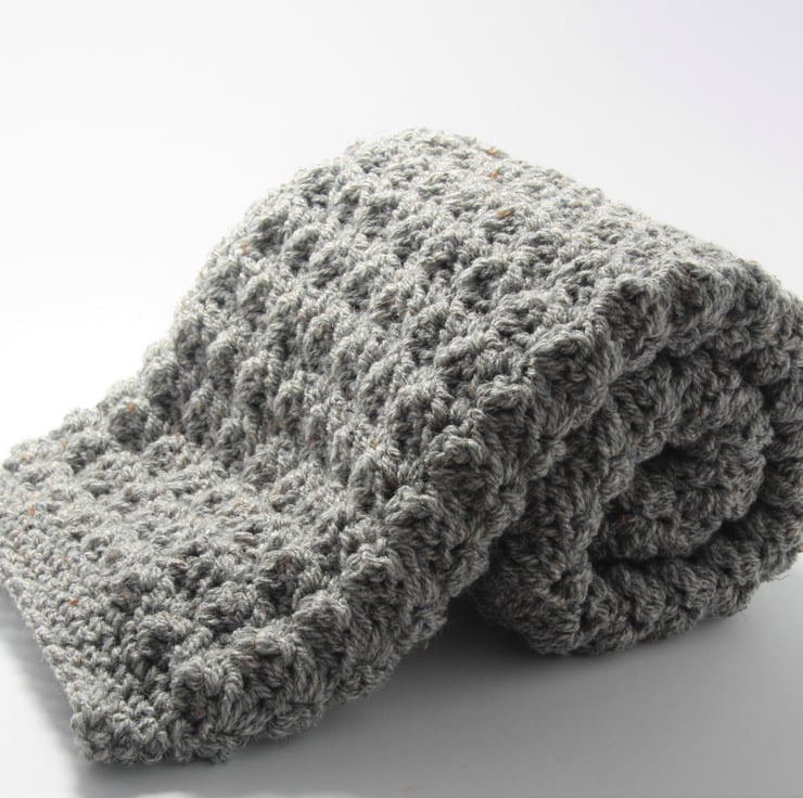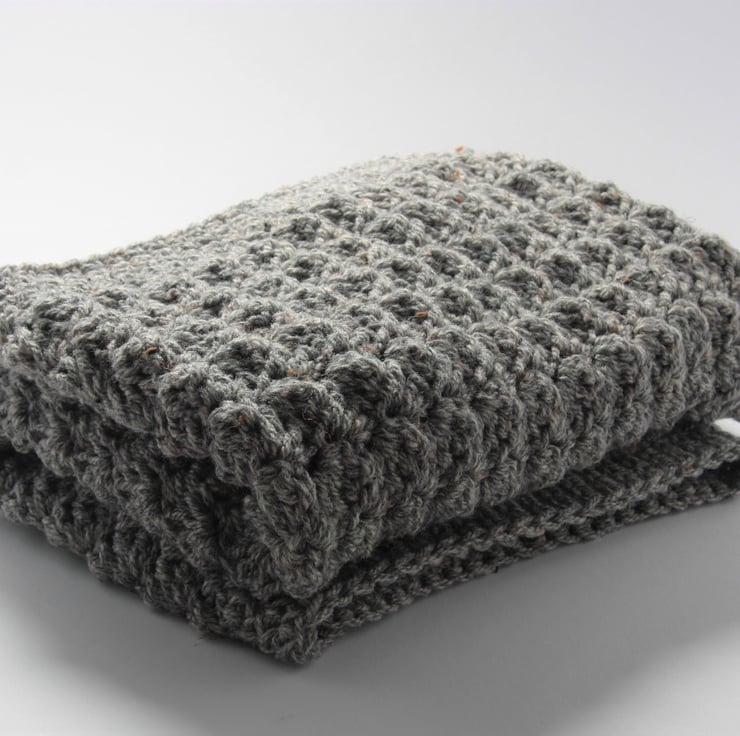I make this using Harris tweed aran wool mix yarn creating a soft, luxurious blanket you just want to snuggle baby up in.