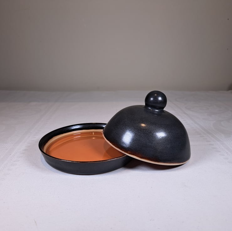 A round butter dish, holding approx. half a pat of butter. A glossy burnt orange inside with a satin charcoal on the outside.