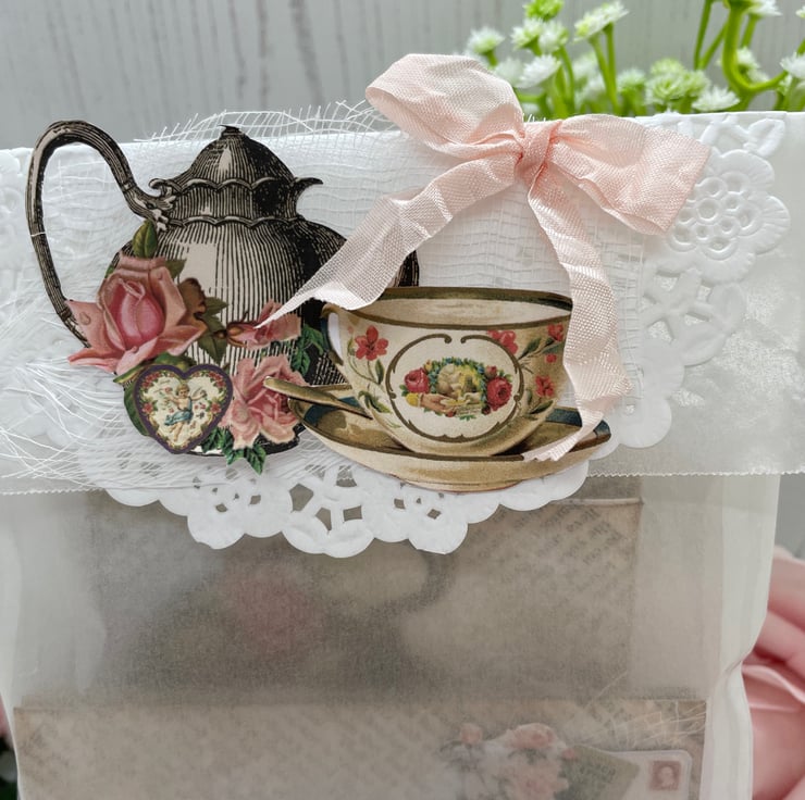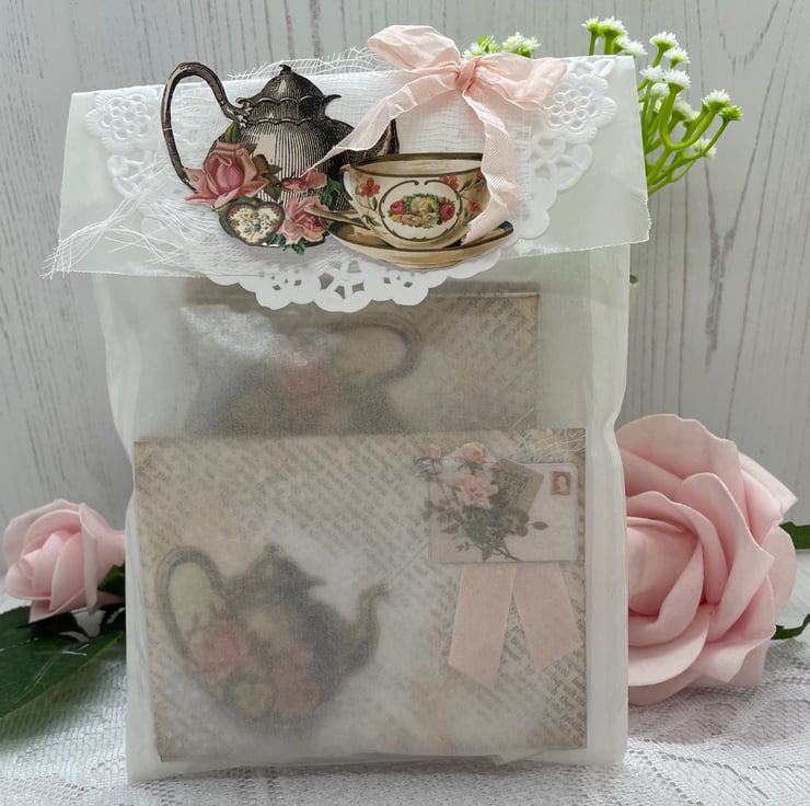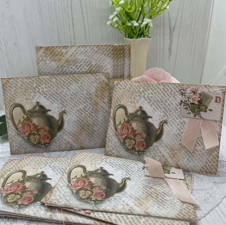 The notelet’s are embellished with a handcut envelope and roses image, mounted onto cheesecloth and ribbon.