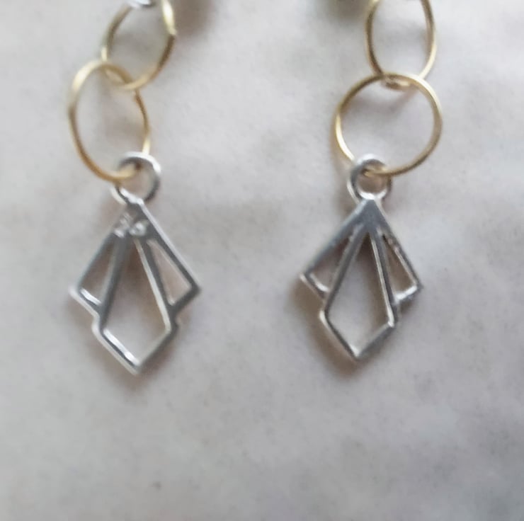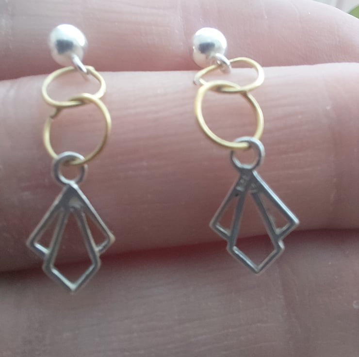 Two tone charm earrings. Made with sterling silver and gold vermeil, (gold plated sterling silver.) These earrings are simple and understated but the gold addition adds interest and style. Inspired by The Tiger Moth, the charm is a resting moth shape made of sterling silver and attached to two gold vermeil jump rings. The earring wire is a simple ball design with a butterfly back, again made with sterling silver.