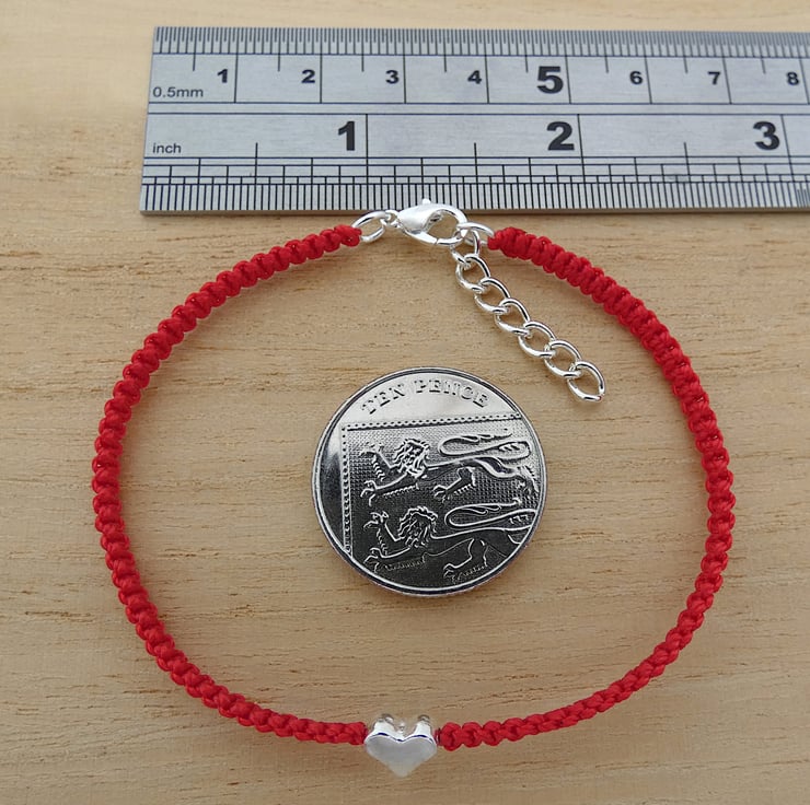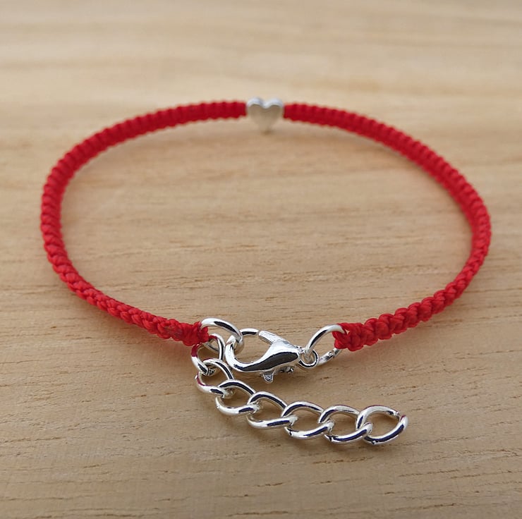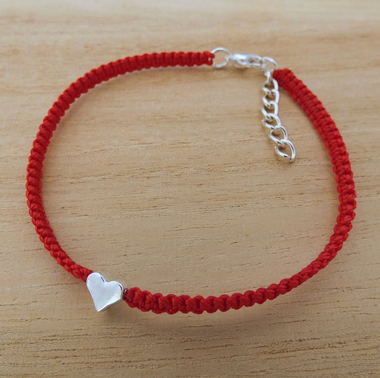 Red adjustable macrame bracelet for women. It is made with strong nylon cord and is 7.25" in length and can be extended another 1" using the extension chain. The dainty heart and clasp are silver plated to compliment the bright red cord. It is a lovely friendship bracelet or would stack perfectly with other bracelets in your collection.