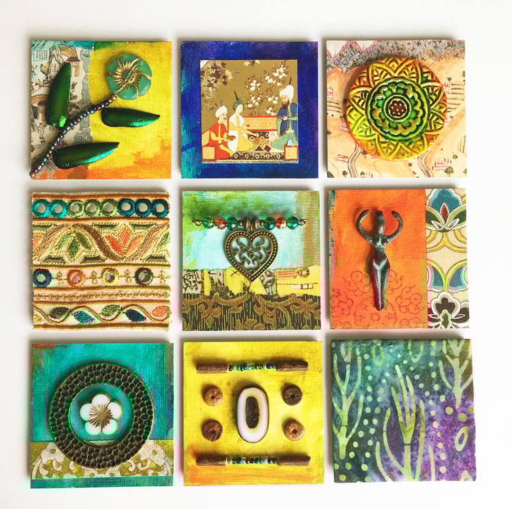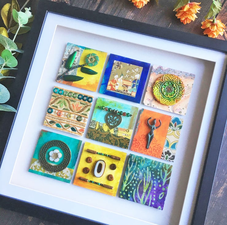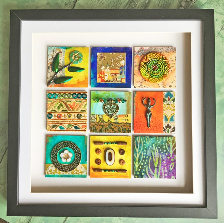 The shadow box frame contains an assemblage of lots of little treasures. Nine mdf squares have been decorated with layers of acrylic paint, papers from old books, batik and a section of Indian embroidery. Other items on display include a section from a pretty vintage playing card, Czech glass beads, a verdigris Mykonos metal charm and a round, painted clay tile.