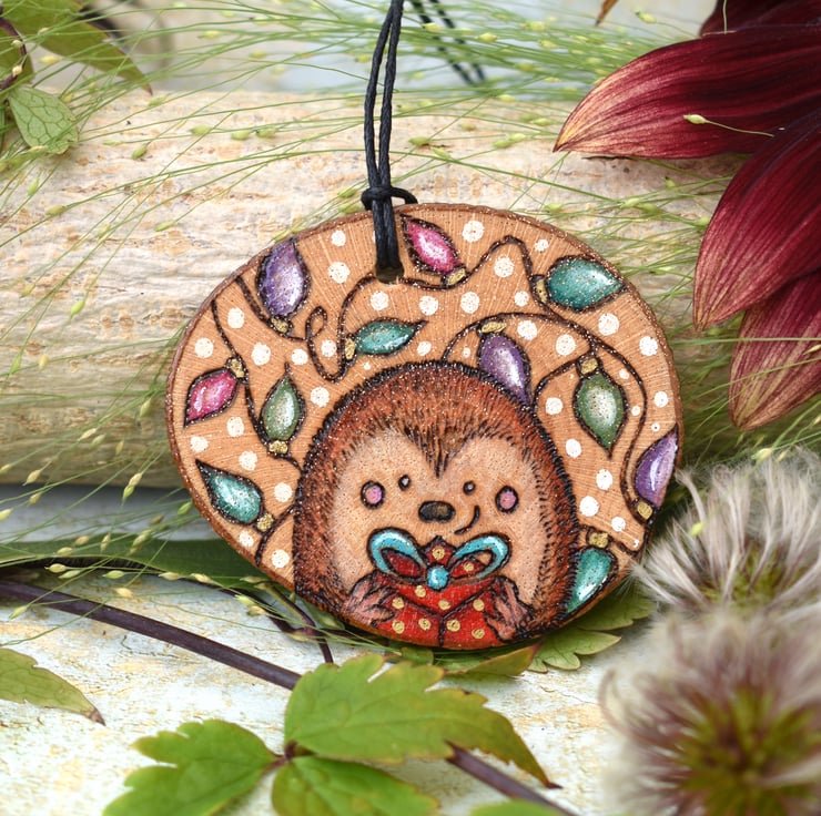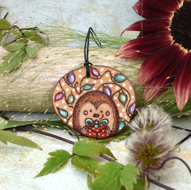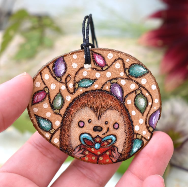 A cute hedgehog with a red gift adorns this festive tree slice Christmas tree decoration. Burned by hand using pyrography and coloured using art pencils. I've stained the wood to enhance it.