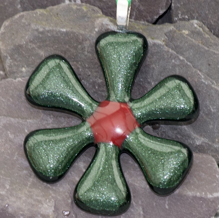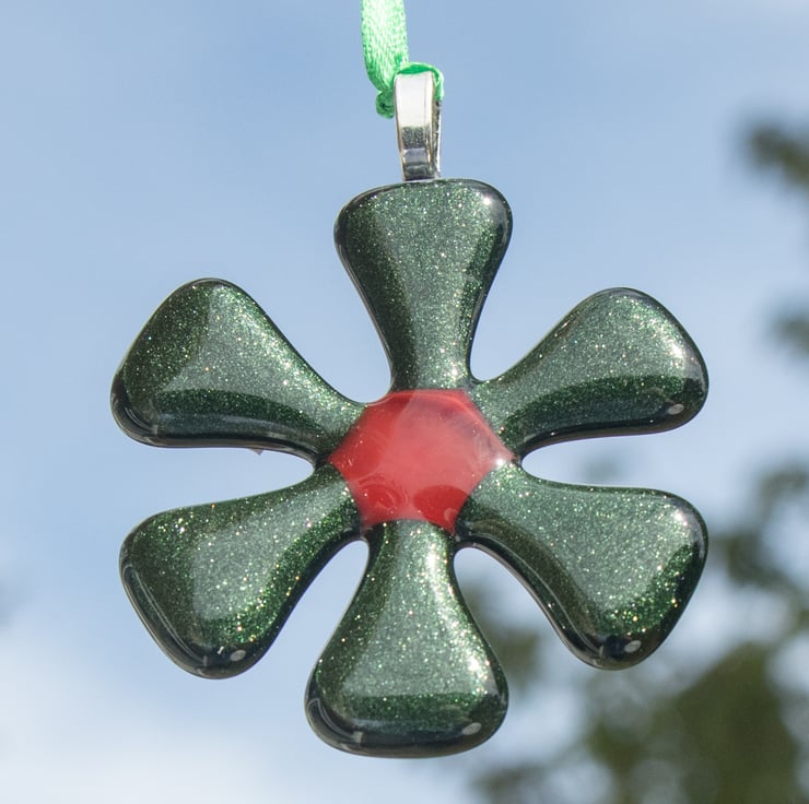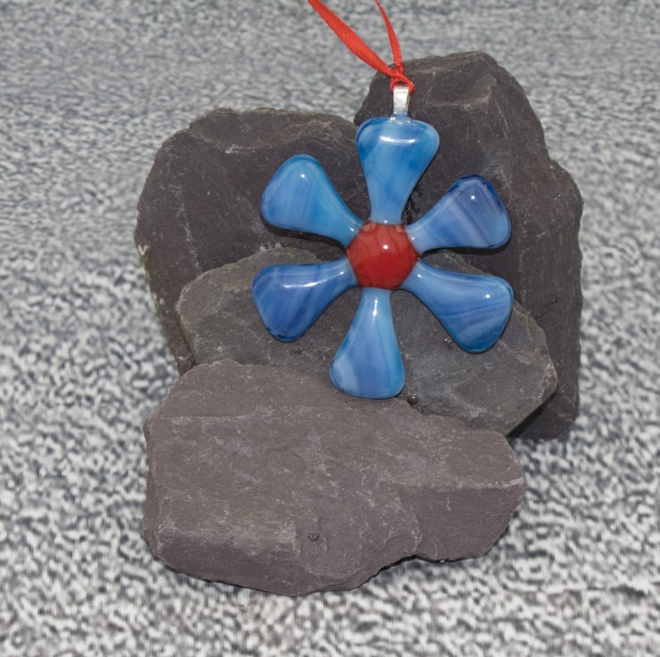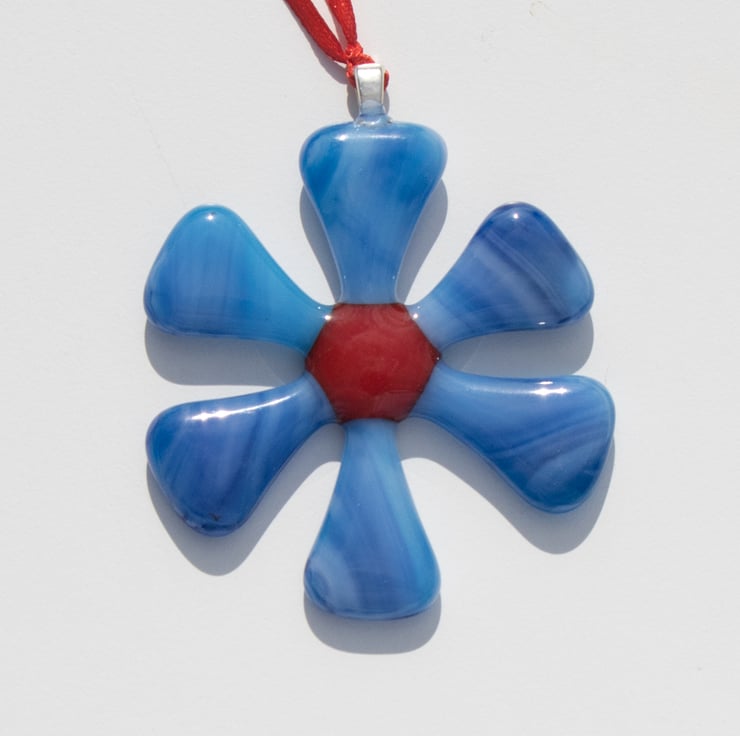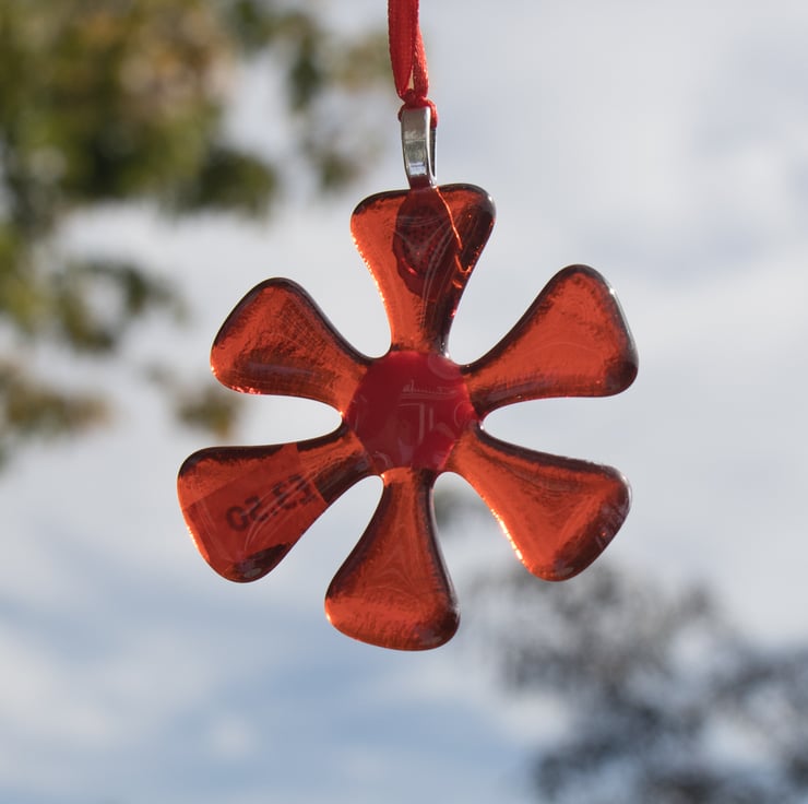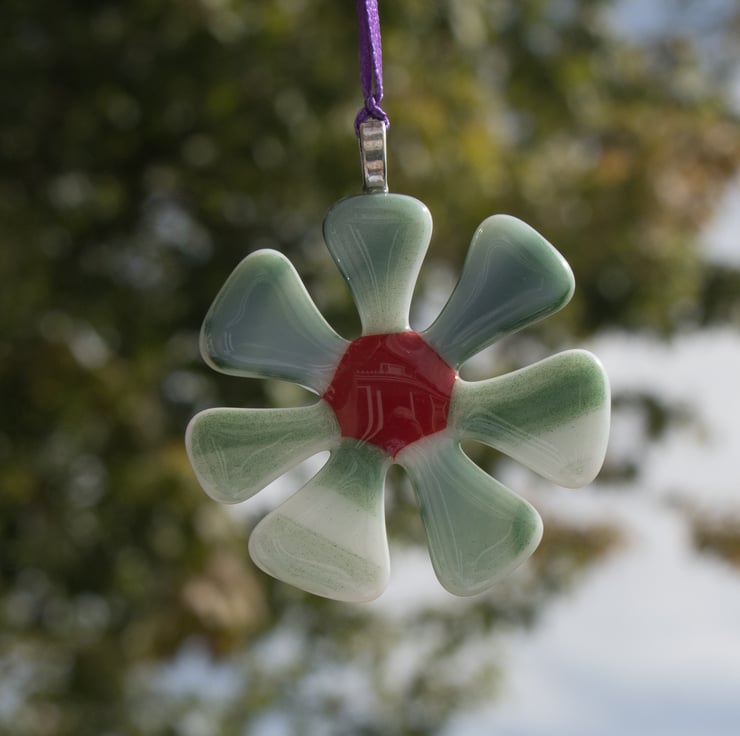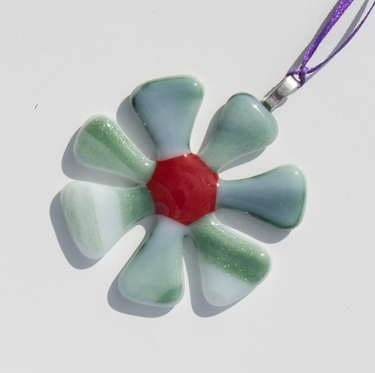 Each flower is approximately 6 cm across and is strung from a length of colourful ribbon. The flowers are made from 6 triangles of hand-cut glass which have been carefully laid out in the kiln with a coloured glass dot in the centre to hold everything together. A session in the kiln fuses the separate pieces together.