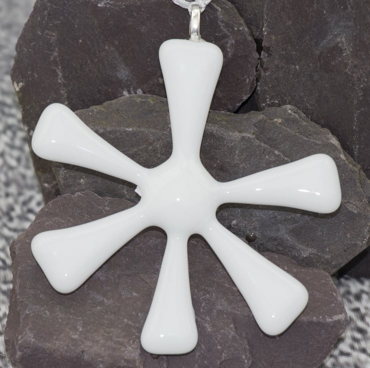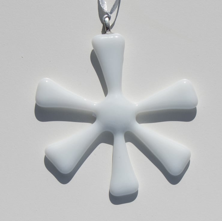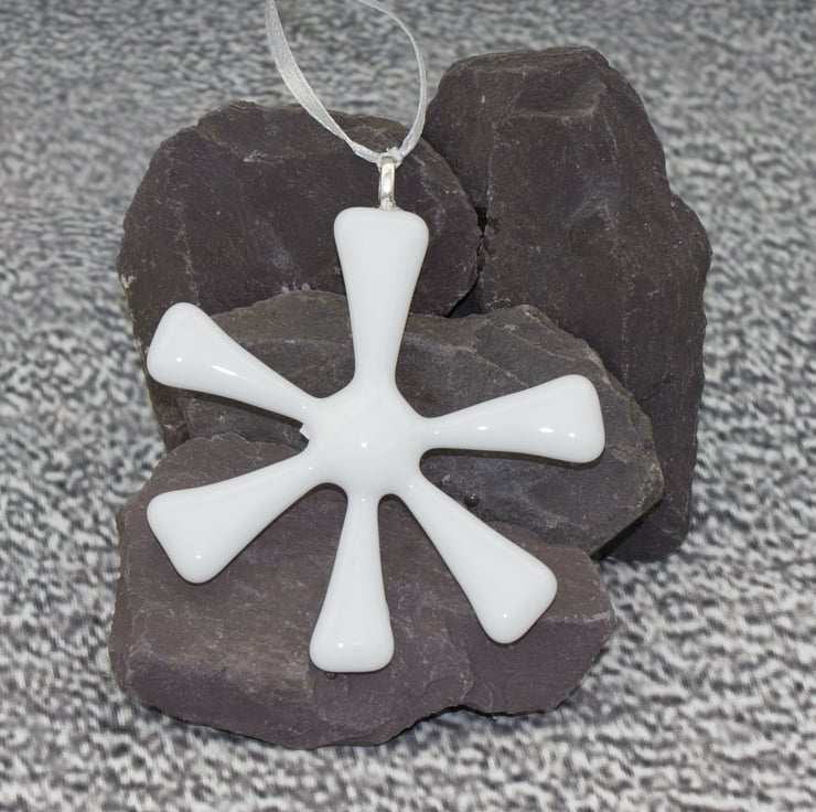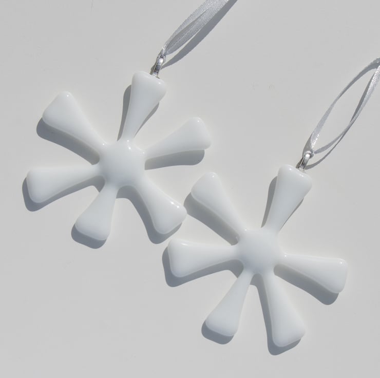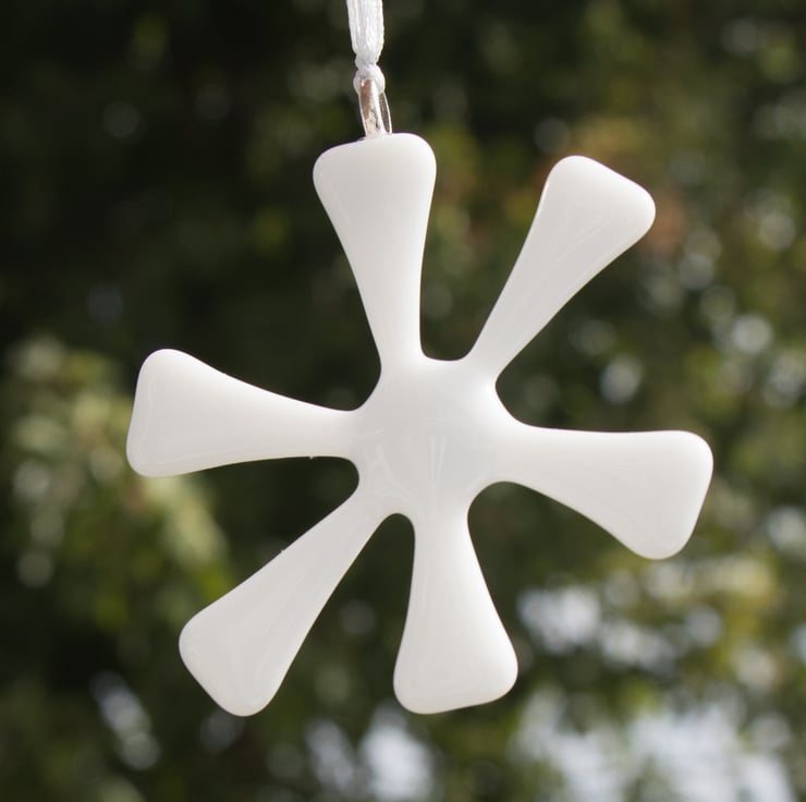 Each snowflake is approximately 6 cm across and is strung from a length of colourful ribbon. The snowflakes are made from 6 triangles of hand-cut glass which have been carefully laid out in the kiln with a glass dot in the centre to hold everything together. A session in the kiln fuses the separate pieces together. We promise that each one of these pieces is unique.