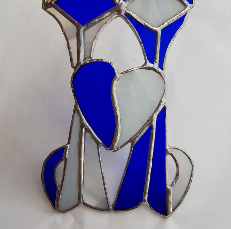 This cat design is hand made using the copper foil technique and a yin yang theme where the two sides compliment each other and create a whole.