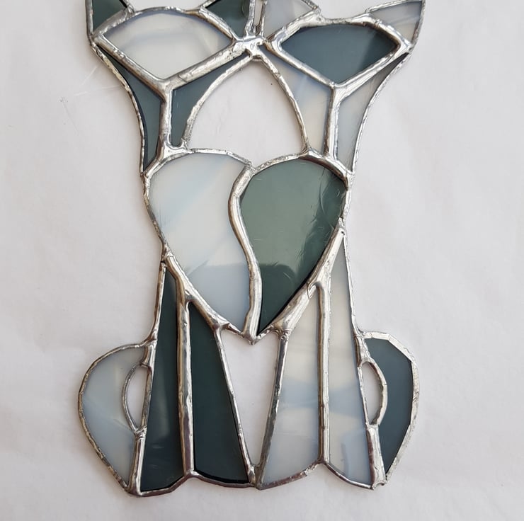 The cats are made using grey and wispy white translucent glass with a ring and invisible thread to hang it with.
