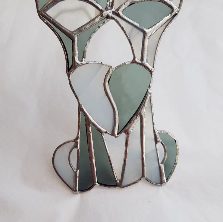 This cat design is hand made using the copper foil technique and a yin yang theme where the two sides compliment each other and create a whole.