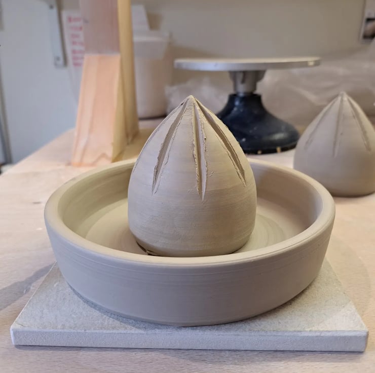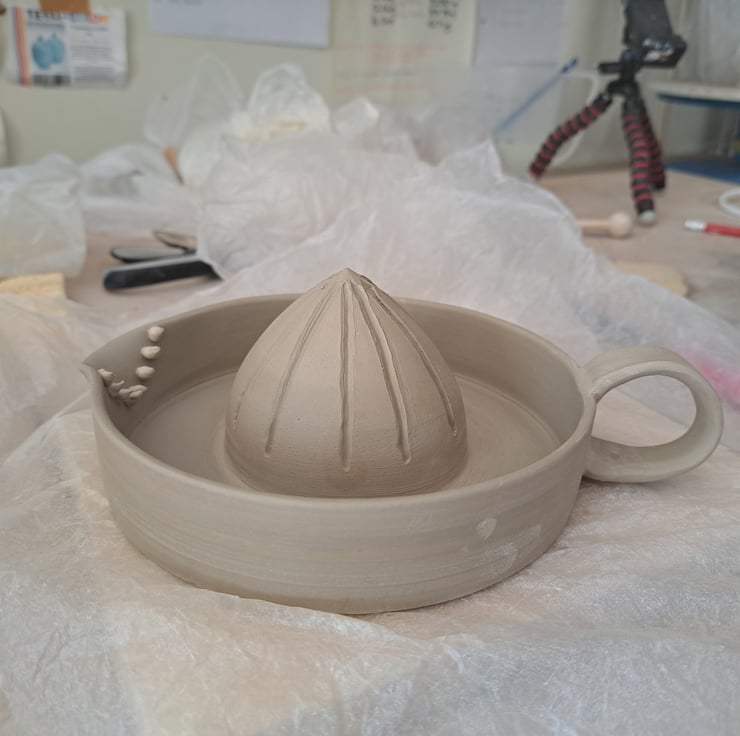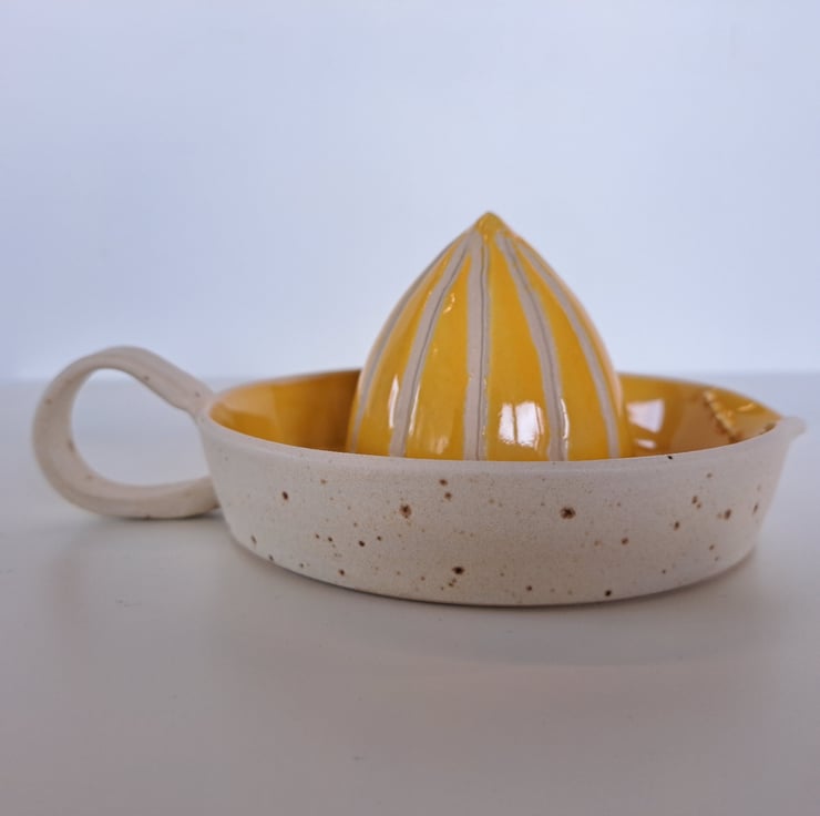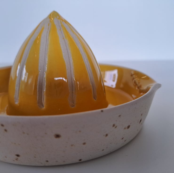 A hand made lemon squeezer, thrown on the wheel in two parts, with a handle added later.