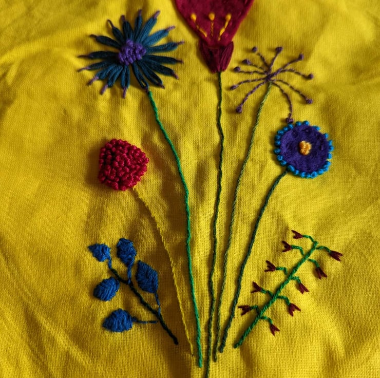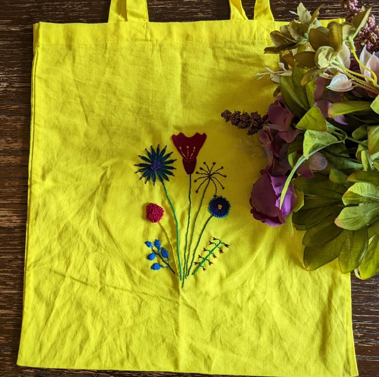 Bright yellow tote bag with embroidered floral design. Measures approximately 36cms by 40cms