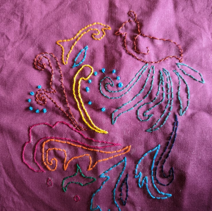 Purple tote bag with an embroidered paisley design. Measures approximately 36cms by 40cms