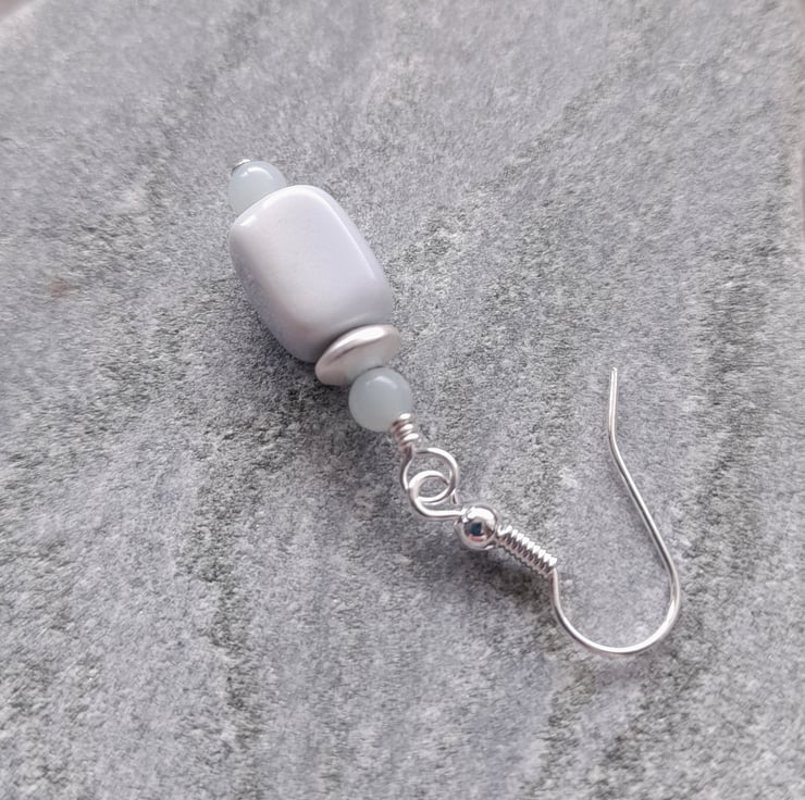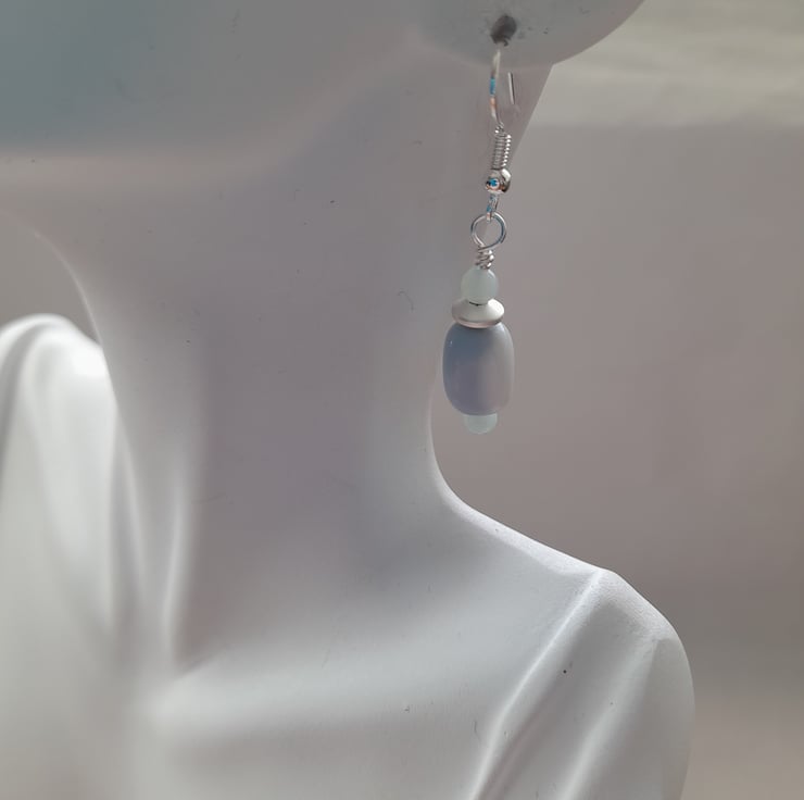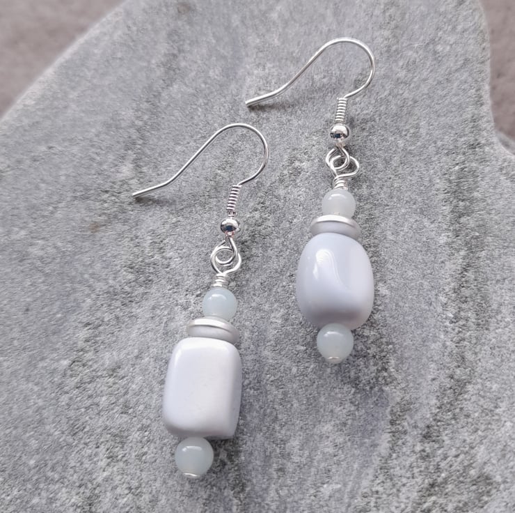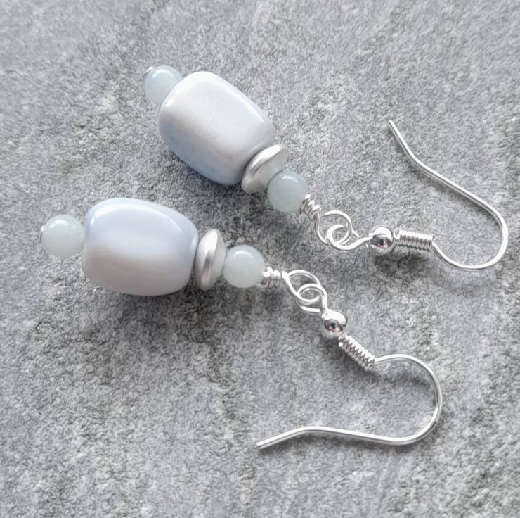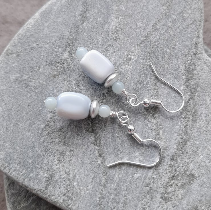 These silver plated earrings have been made with blue opal and small amazonite semi-precious gemstones and matt silver plated hematite.