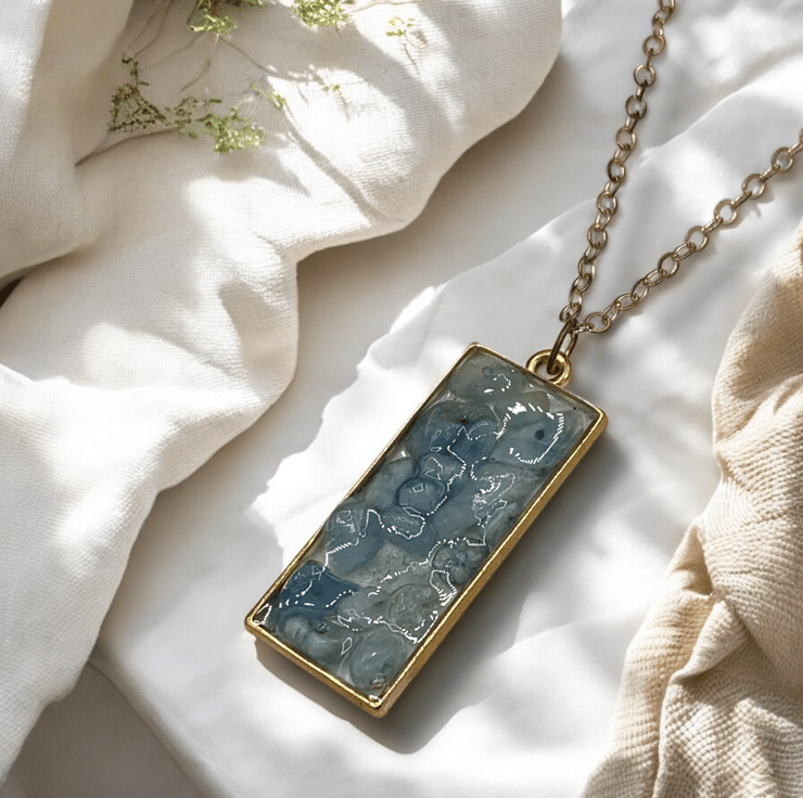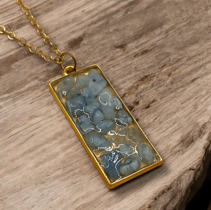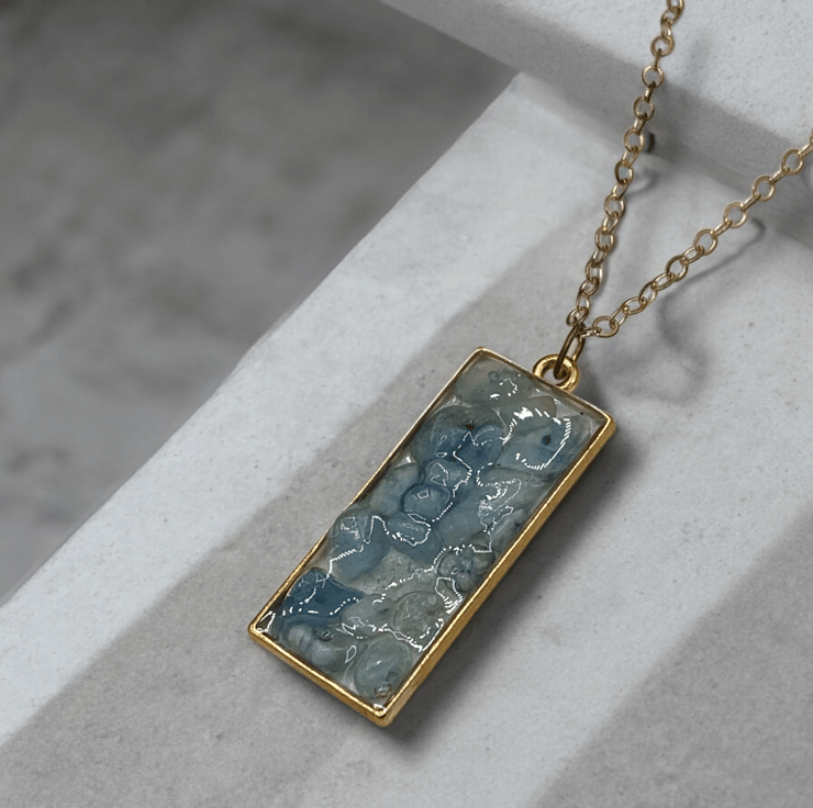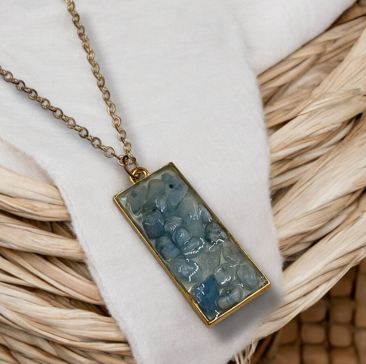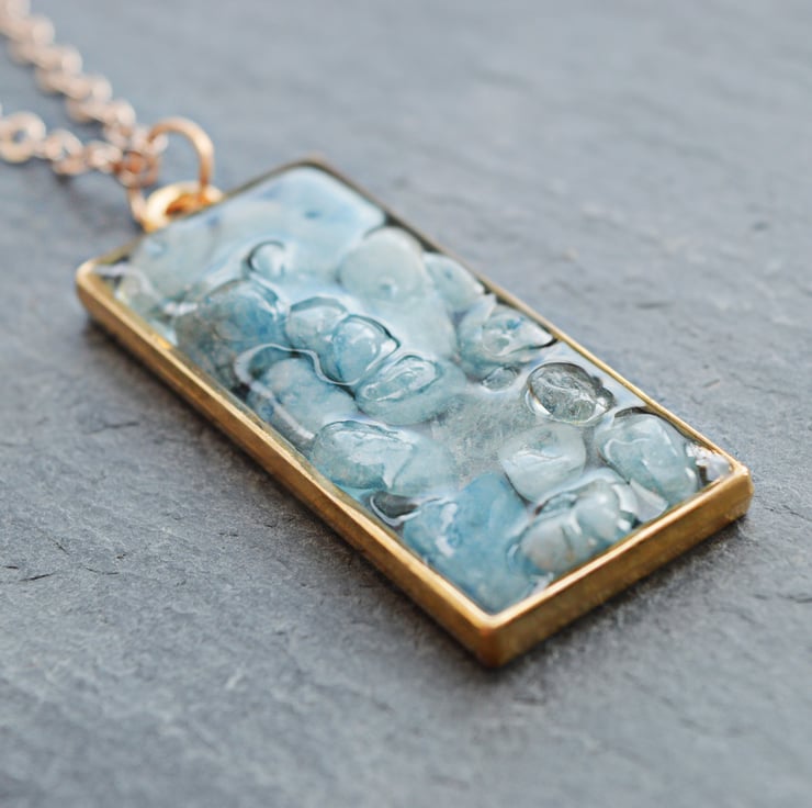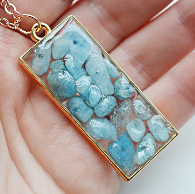 Handmade with Genuine Natural Aquamarine chips. The tiny nuggets are cured within Vegan Friendly Eco Resin in an open Rose Gold plated rectangular shaped bezel, as the focal point of this collar length necklace and suspended from a Rose Gold plated cable chain completed with a lobster claw clasp.