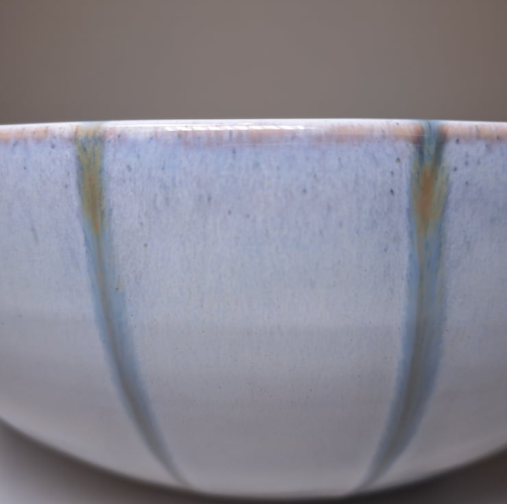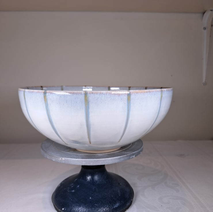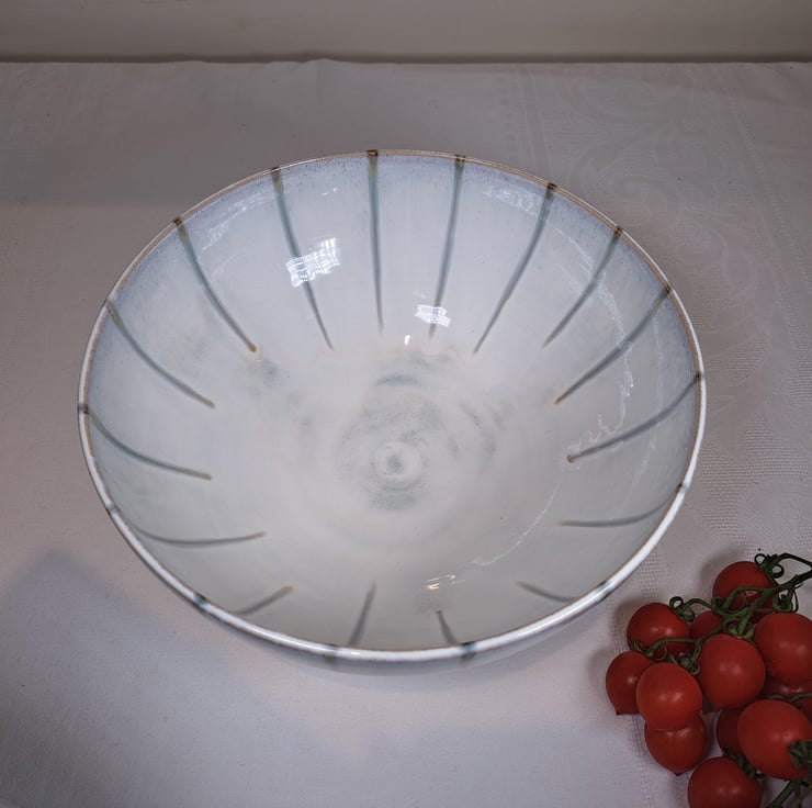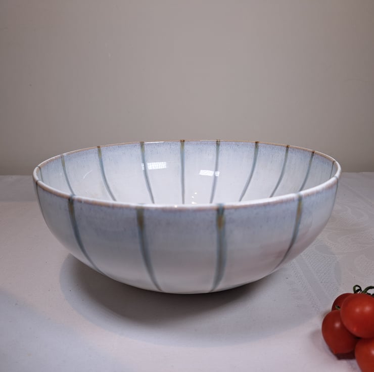 A hand made stoneware bowl with a glossy off white glaze with another glaze applied to produce green runs of colour producing a striped appearance.