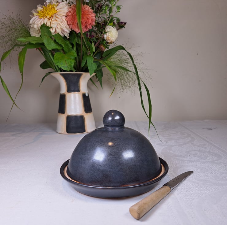 Thrown on the wheel from white stoneware, the butter dish is suitable for daily use and goes in the dishwasher.