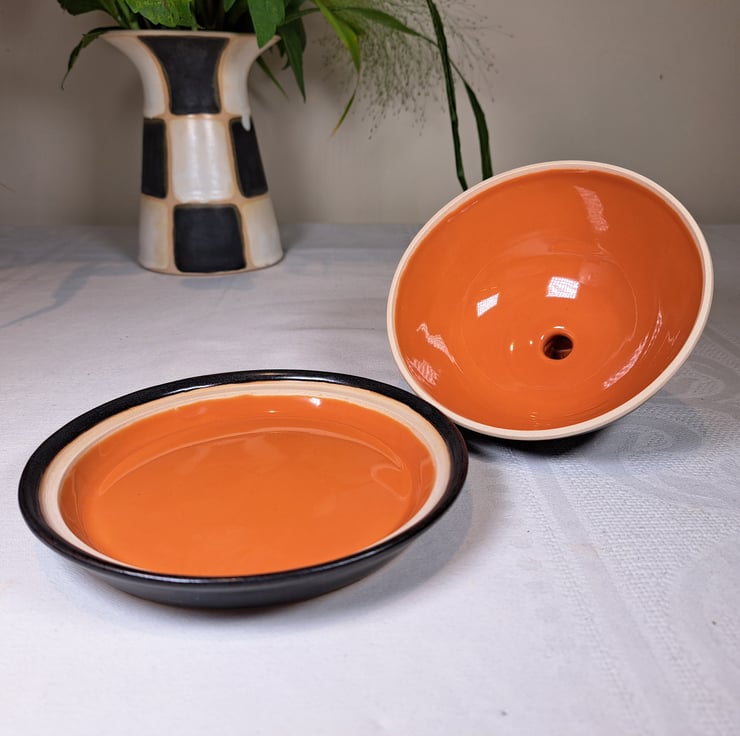 The interior has a burnt orange glossy glaze with a satin matt charcoal glaze on the outside which is slightly mottled.