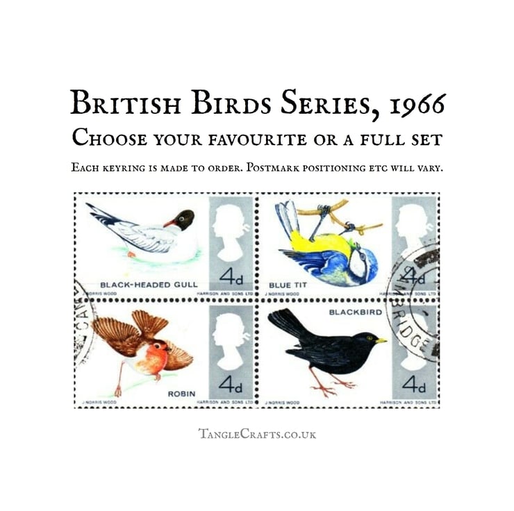 This charming, upside down(!) blue tit has been captured in a one of a kind keyring, made by upcycling a real vintage British postage stamp from 1966 - a great small birthday or anniversary gift idea! Alternative garden bird options available; full details below: