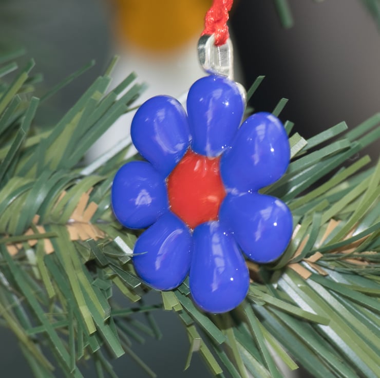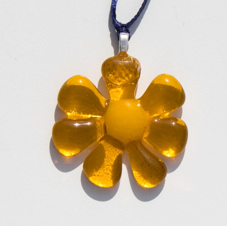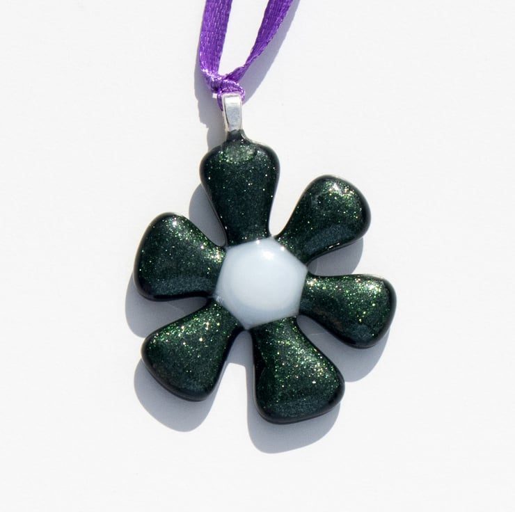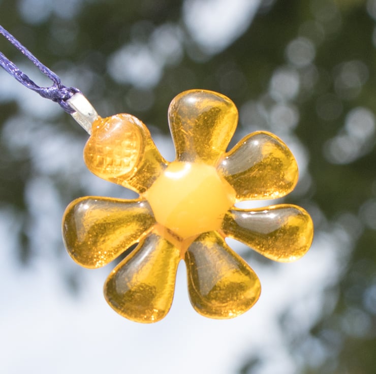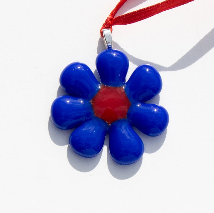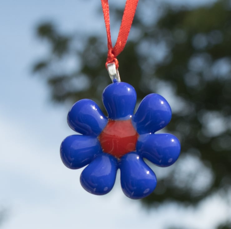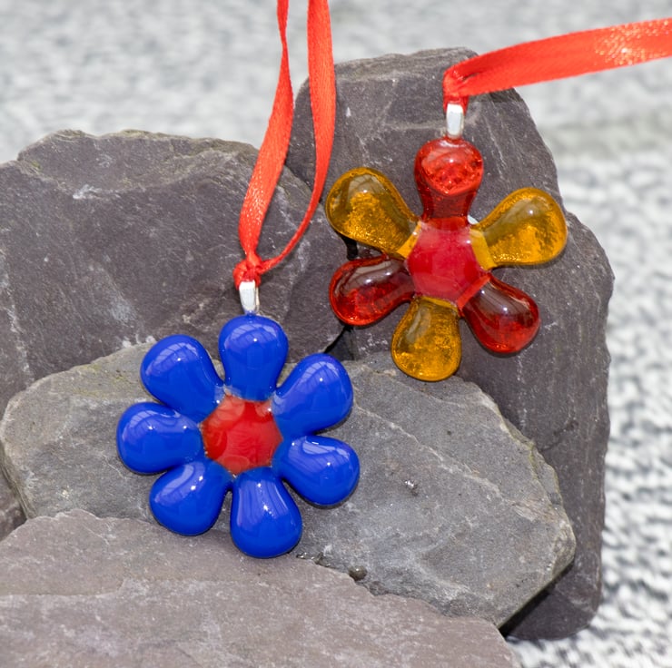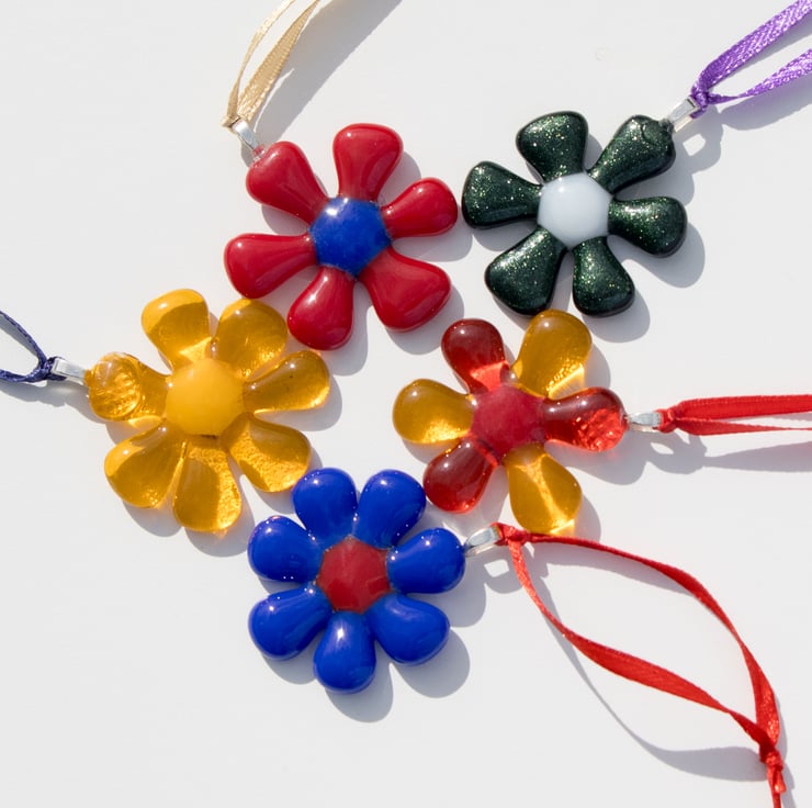 Each flower is approximately 4 cm across and is strung from a length of colourful ribbon. The flowers are made from 6 triangles of hand-cut glass which have been carefully laid out in the kiln with a glass dot in the centre to hold everything together. A session in the kiln fuses the separate pieces together. Some feature translucent glass, some streaky colours and others solid colours. We promise that each one of these pieces is unique.
