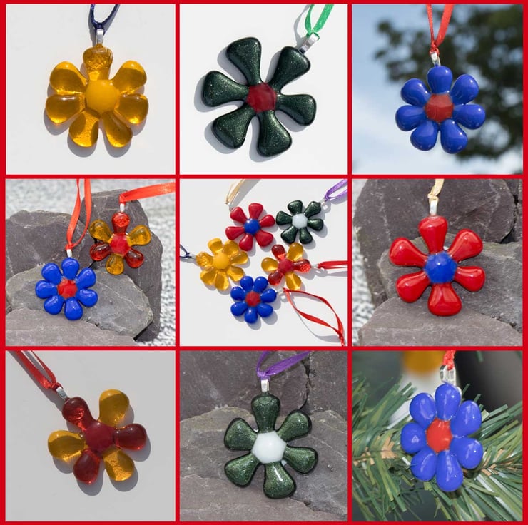 The final photo shows our small Fused Glass Snowflakes which are similar to these flowers but feature white glass. They are also featured in the shop.