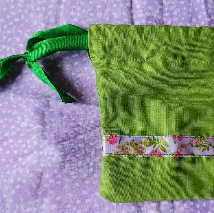 A coin pouch that uses ribbons acting as a drawstring to close. Ideal for tiny items as extra gifts on top of a birthday or Christmas or special occasion gift!