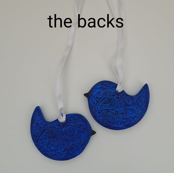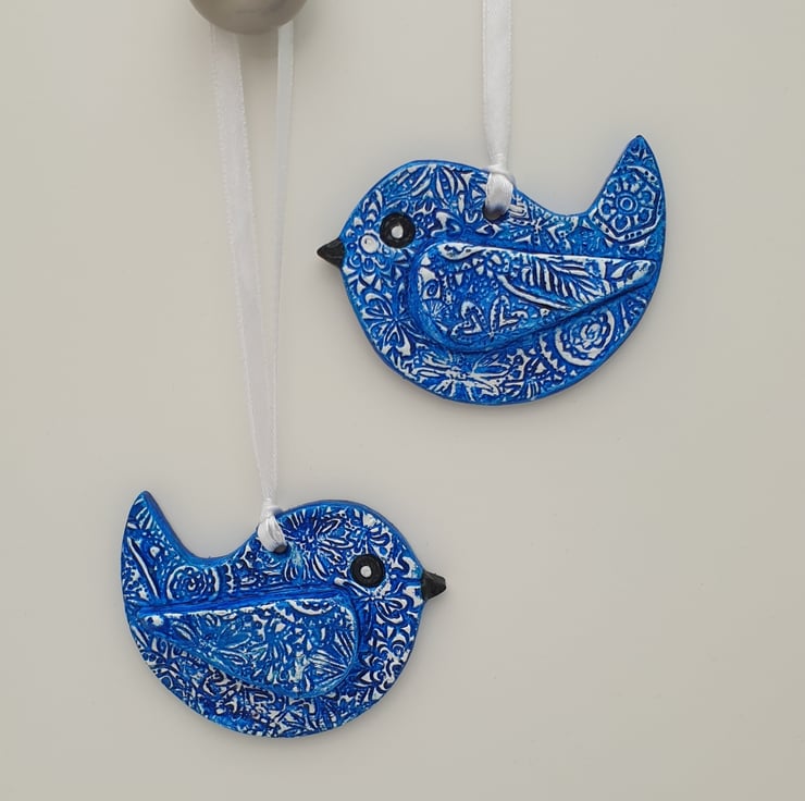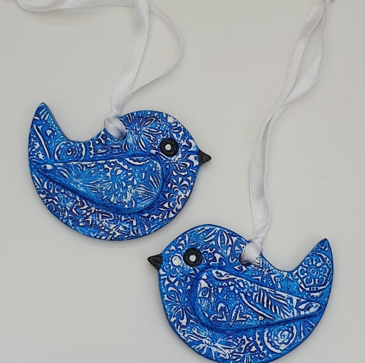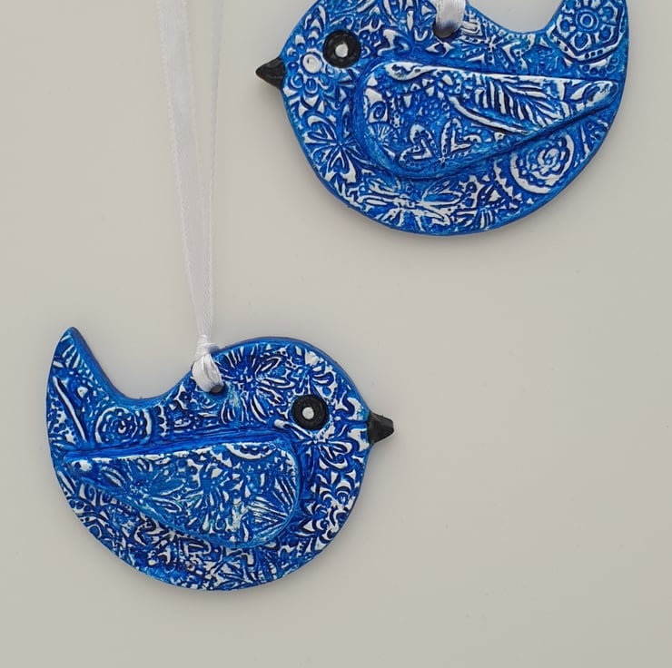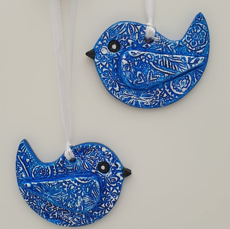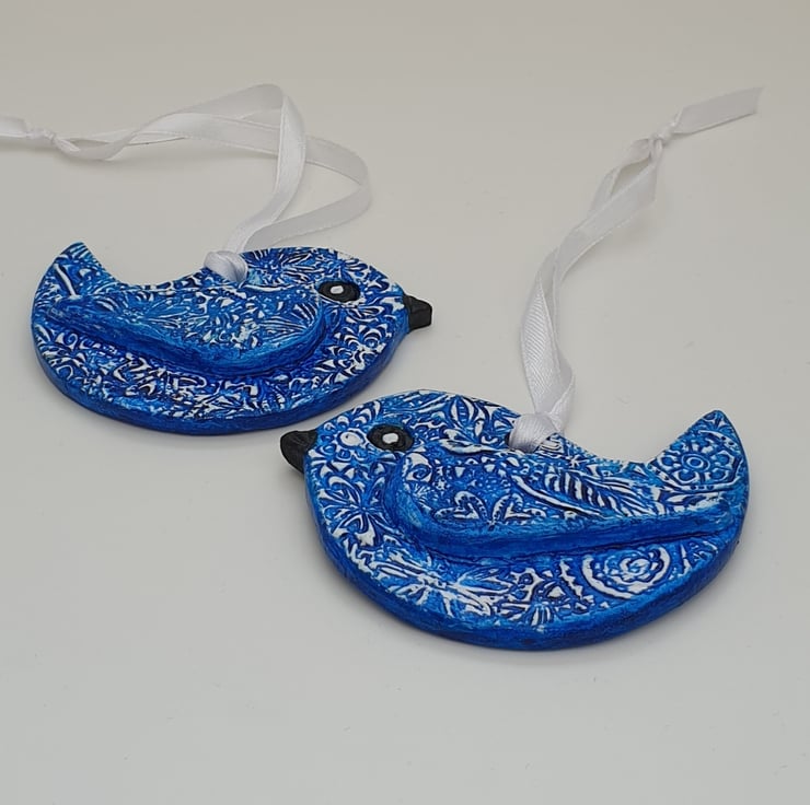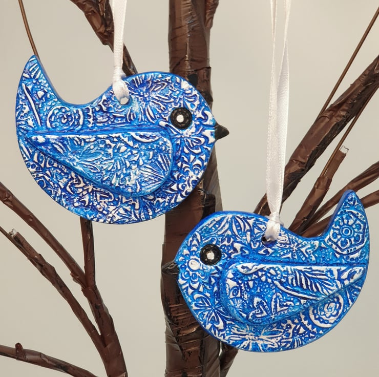 Beautiful pair of blue and white bird hanging decorations which have been lovingly handcrafted from air dry clay. The birds have been decoratively embossed and handpainted with acrylics. The front of the birds are blue and white and the back of the birds are blue. This delightful pair are supplied ready to hang with white ribbon. These lovely little birds would make a great addition to your home decor all year round hung in a window, from a handle, knob or mantlepiece and could be popped on a Christmas tree. They will come prettily wrapped in tissue paper and would make a lovely gift for a bird lover.