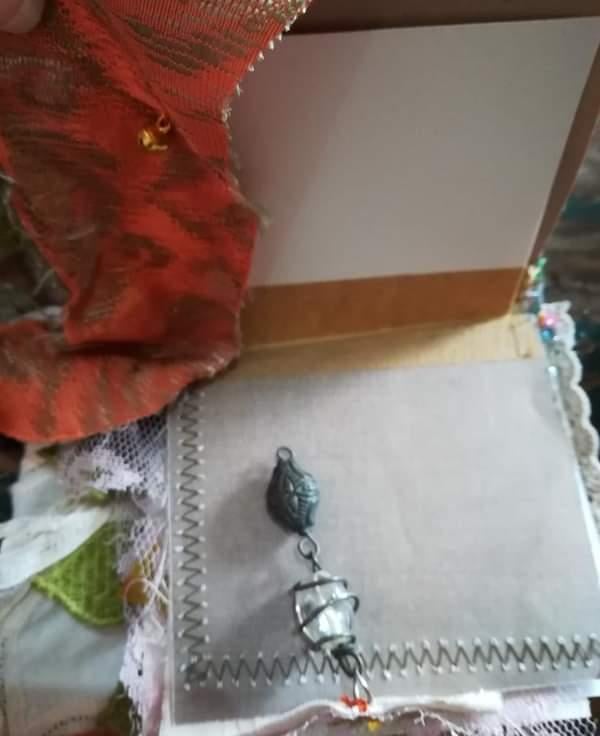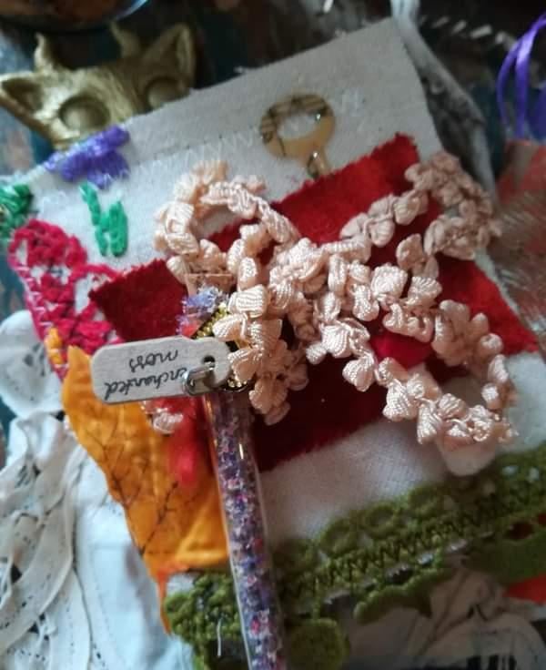 A mini art book, made using vintage fabrics and papers , a little prop with spaces for you to add your own notes and trinkets