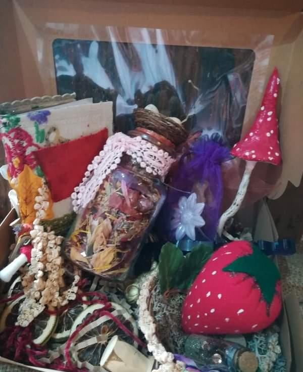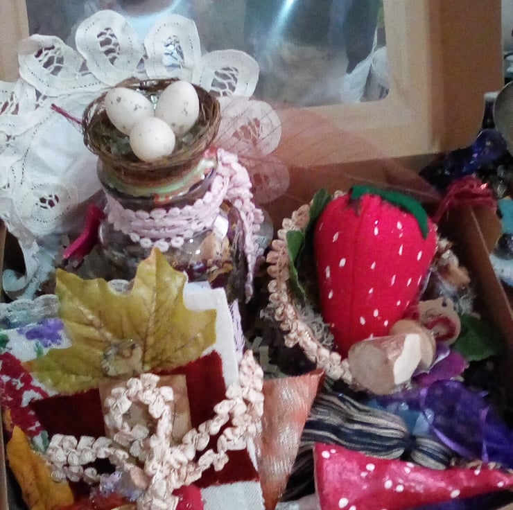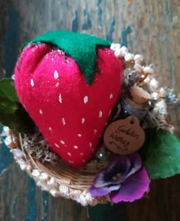 Small wicker 'nest' trimmed with vintage ribbon embellishment, small viola flowers, a handmade felt strawberry and a small glass bottle of goblin wishes