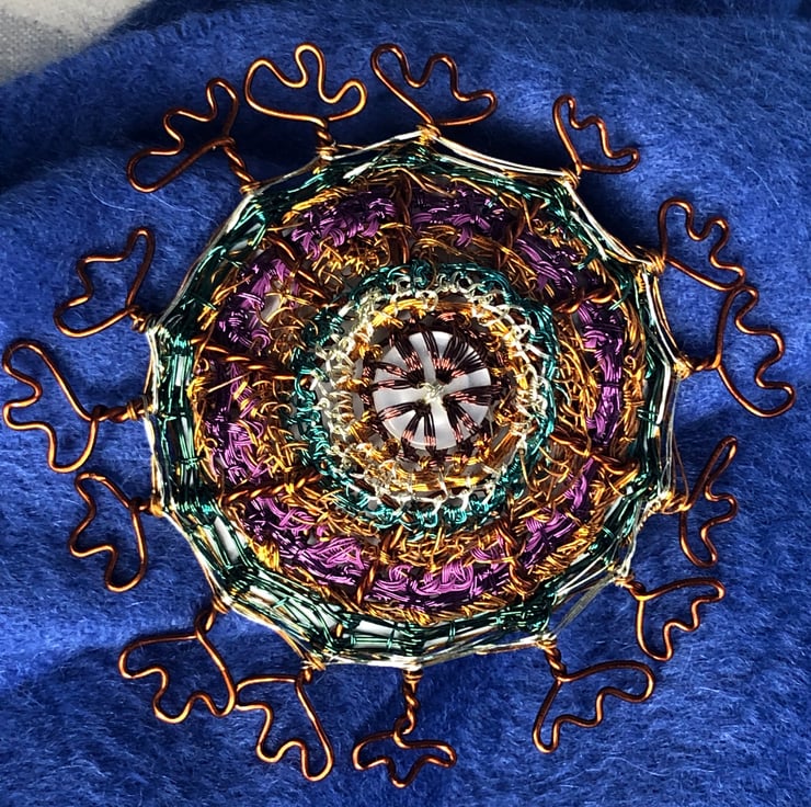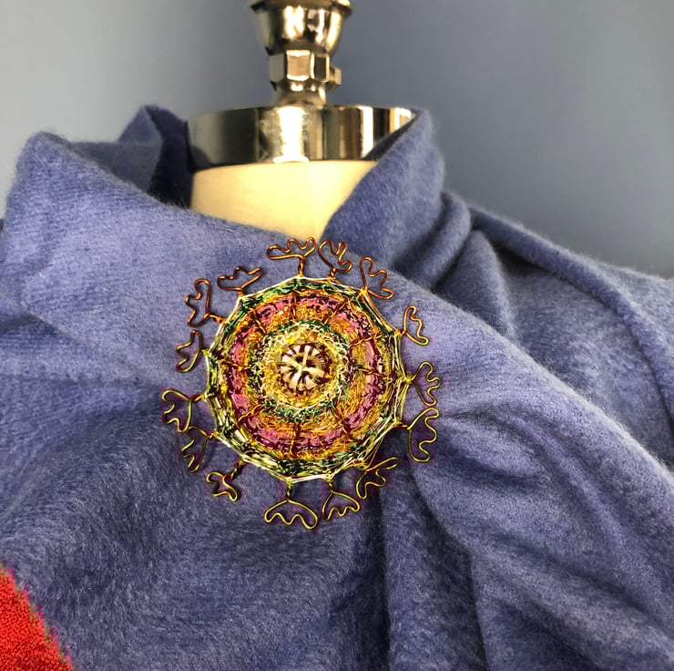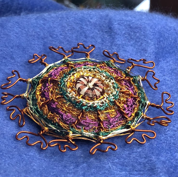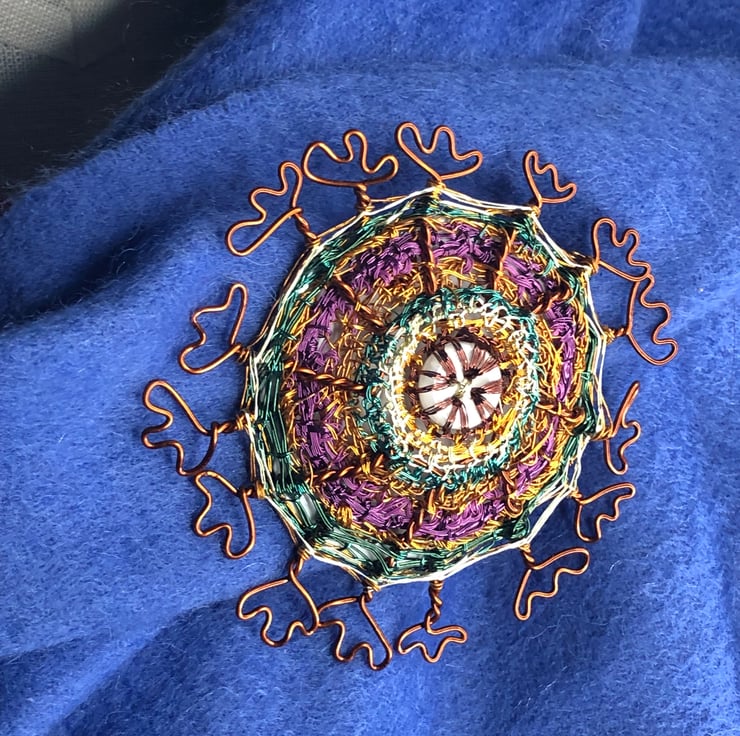 Large Covid Brooch made from repurposed and recycled materials including wire from televisions, motors, and a button from a school shirt. To mark the pandemic, I have made a number of brooches to represent the image of the virus that has impacted us all since 2019.