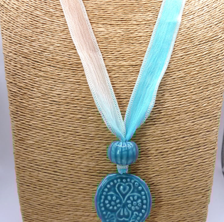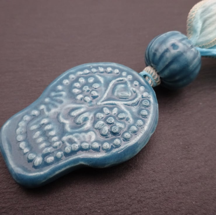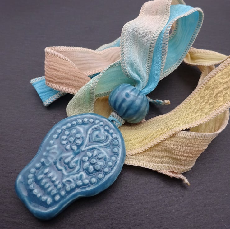 A necklace made with hand dyed silk ribbon, it features a handmade ceramic skull pendant and bead.